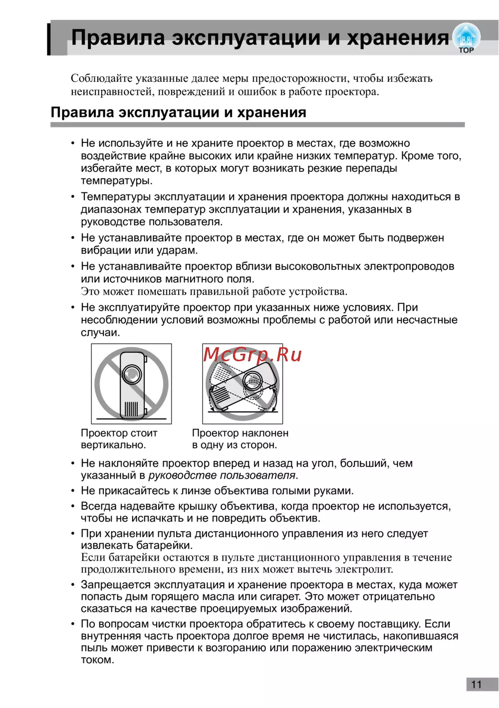 • Запрещается эксплуатация и хранение проектора в местах, куда может