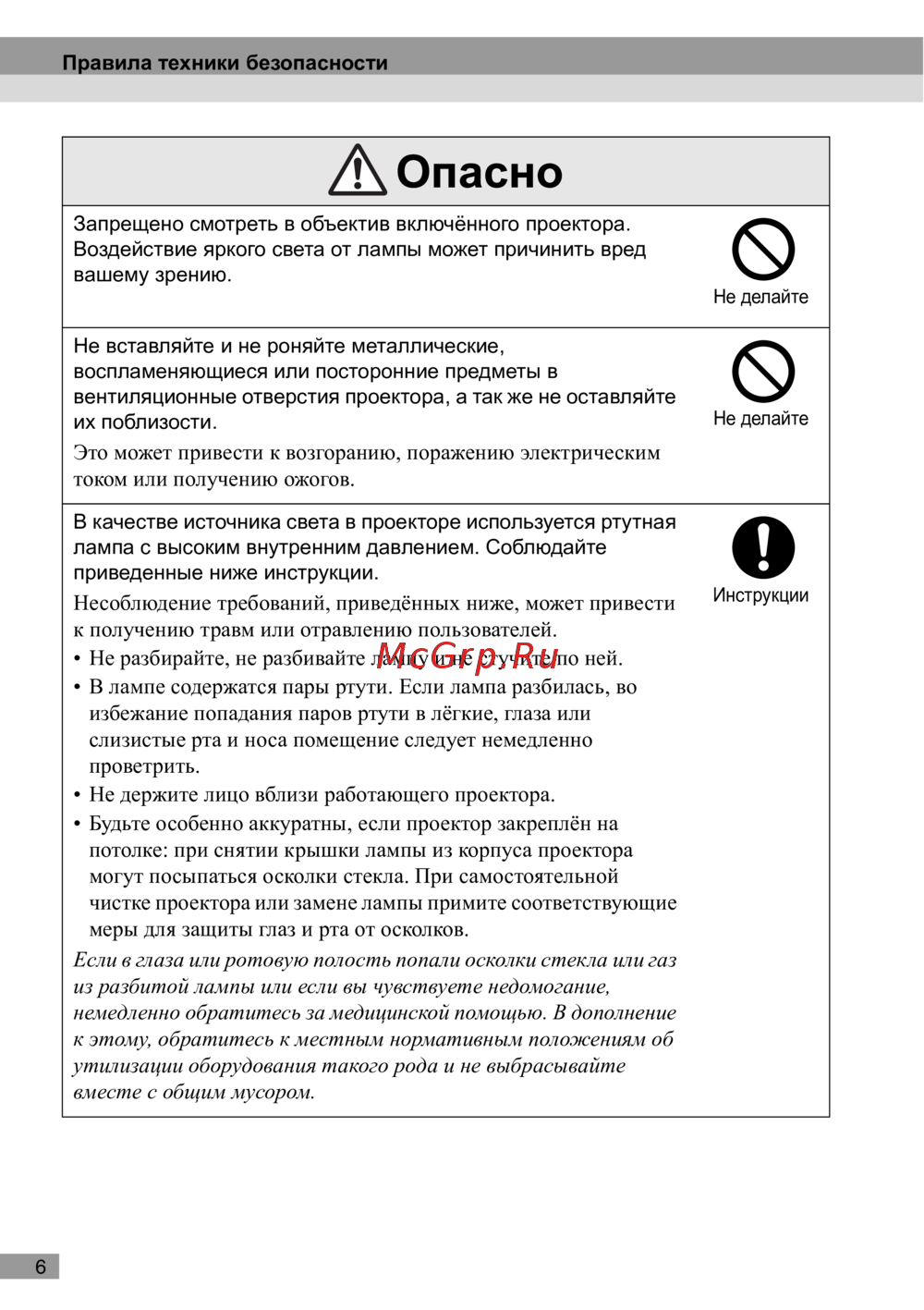 - Соблюдайте указанные далее меры предосторожности чтобы избежать неисправностей повреждений и ошибок в работе проектора p.11