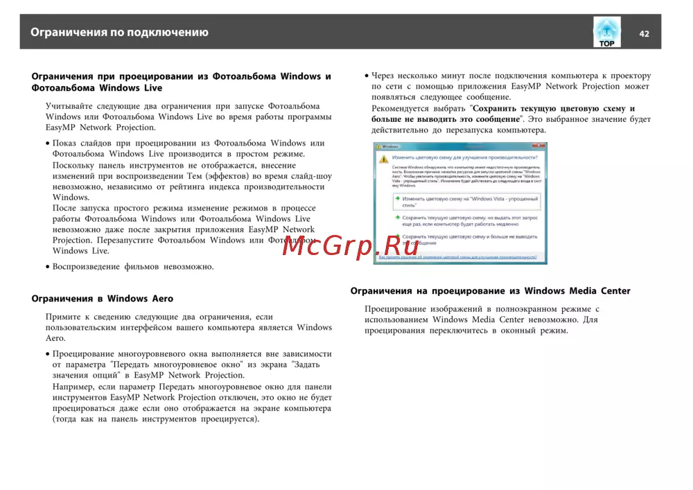 Epson EB-1761W — ограничения проецирования из Фотоальбома и Windows Media Center [42/54]