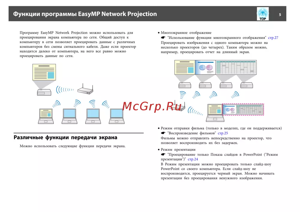 - Проецирование фильмов с компьютера режим отправки фильма p.25