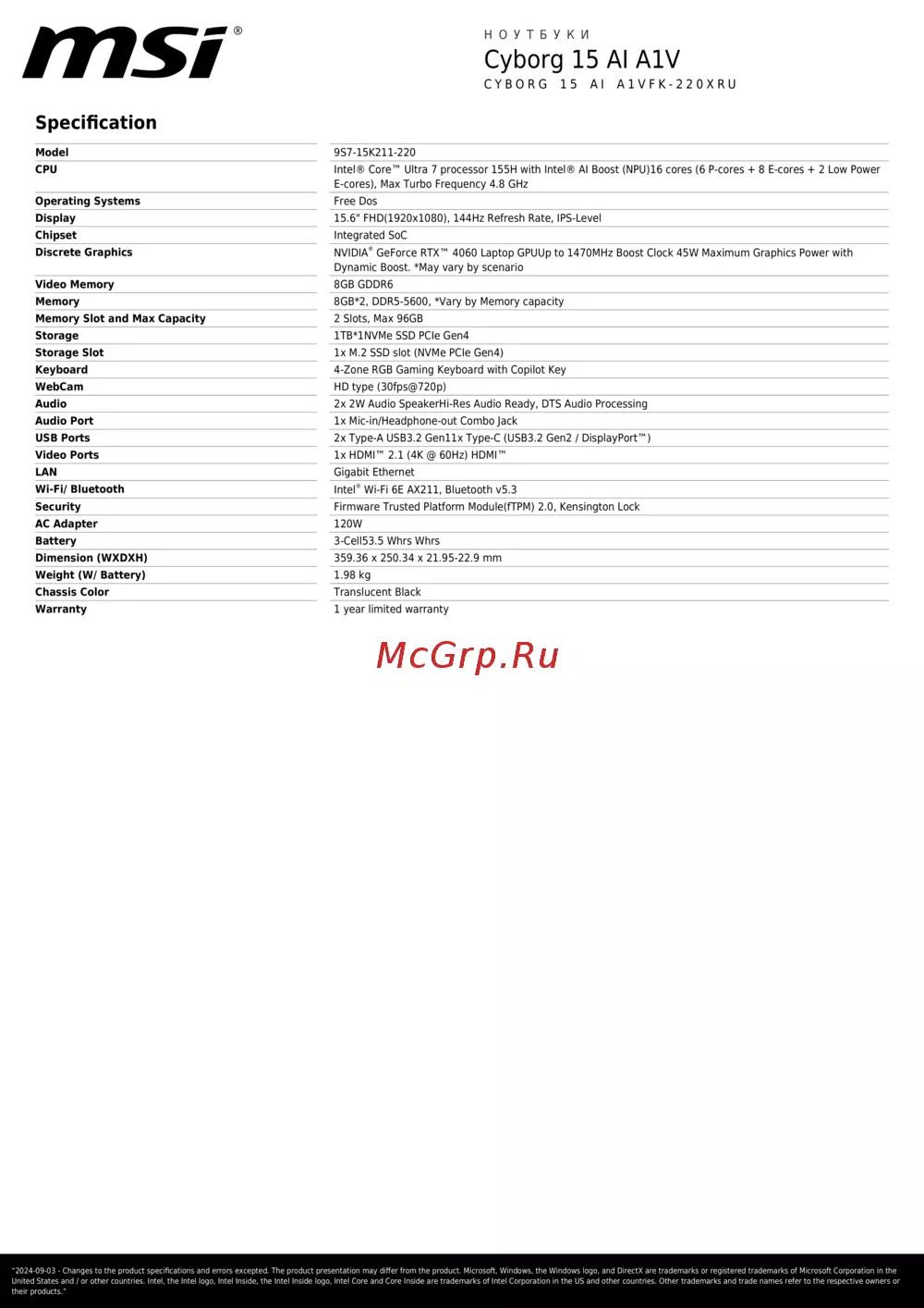 MSI Cyborg 15 AI A1VFK-220XRU (9S7-15K211-220) Спецификация онлайн
