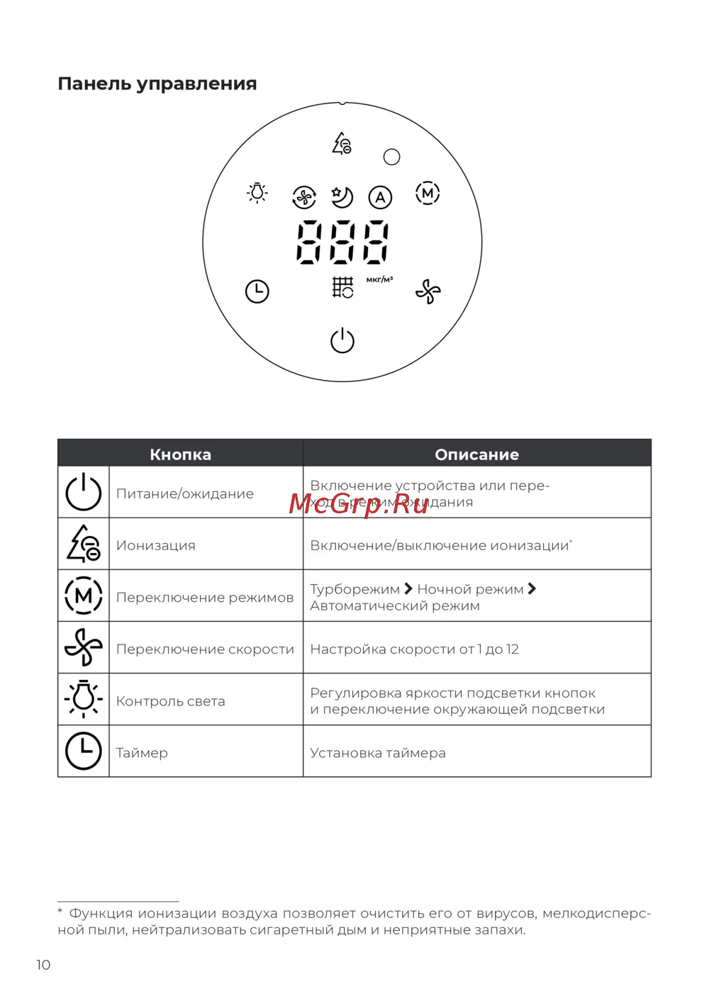 Узнайте о функциях панели управления, включая ионизацию, режимы работы и настройку скорости. Очистите воздух от загрязнений и неприятных запахов.