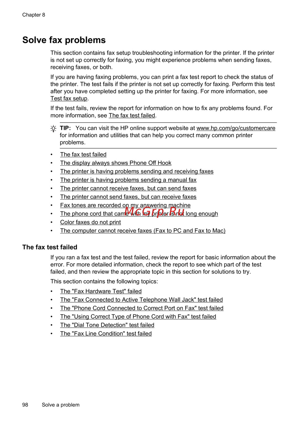 the printer. The test fails if the printer is not set up correctly for faxing. Perform this test