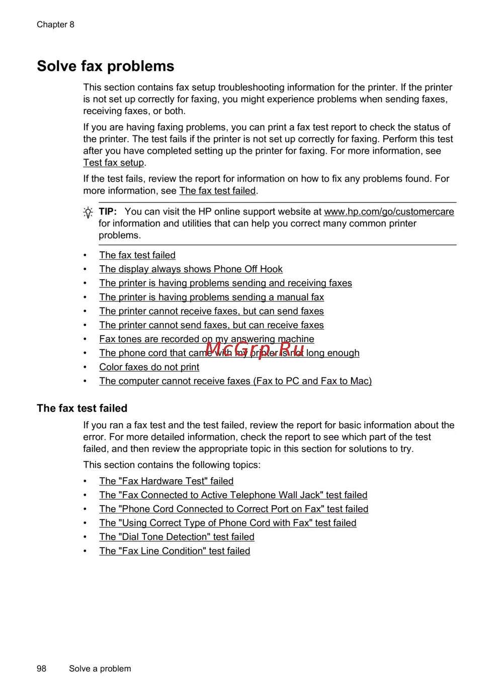 This section contains fax setup troubleshooting information for the printer. If the printer