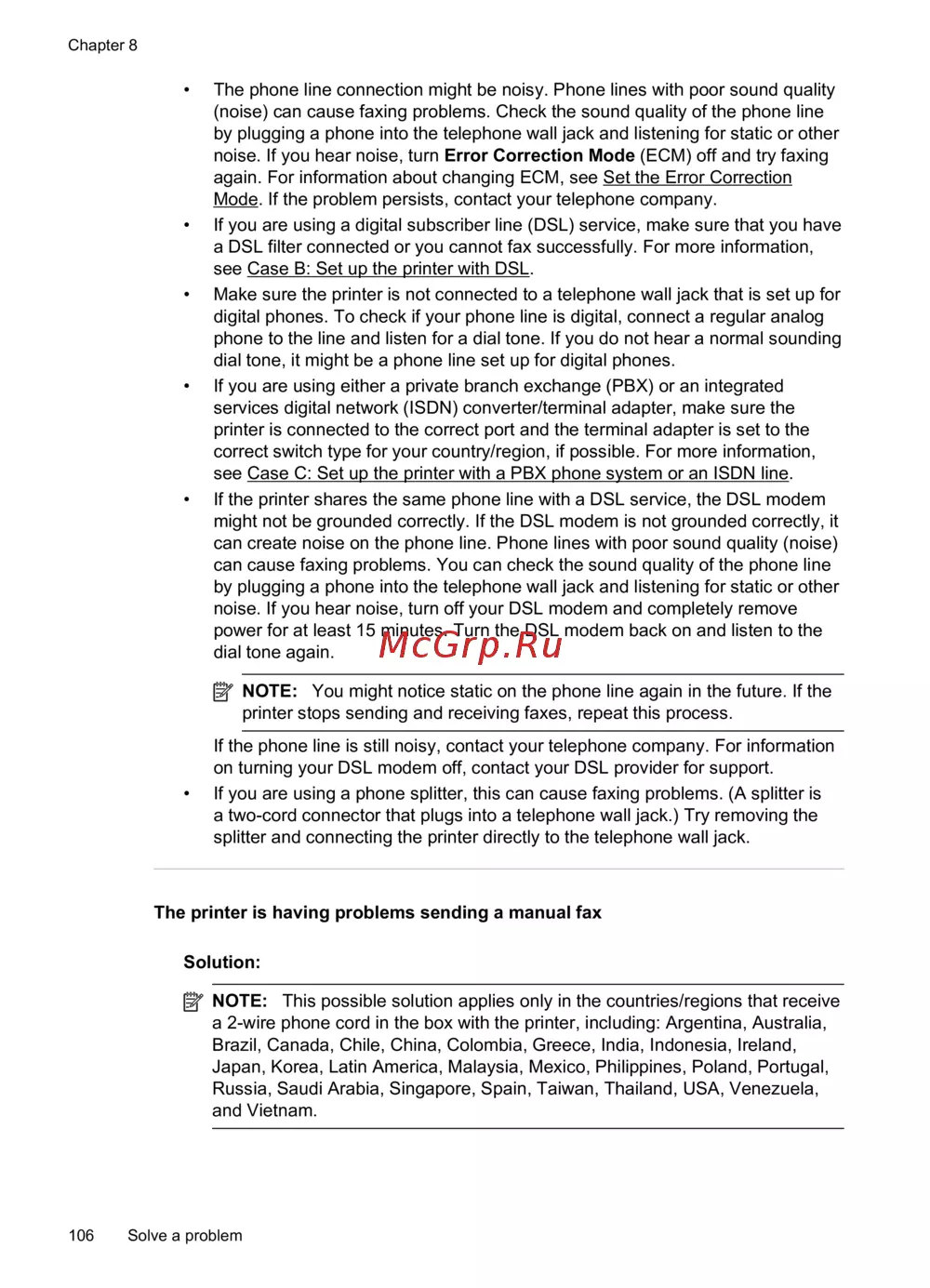 (noise) can cause faxing problems. Check the sound quality of the phone line