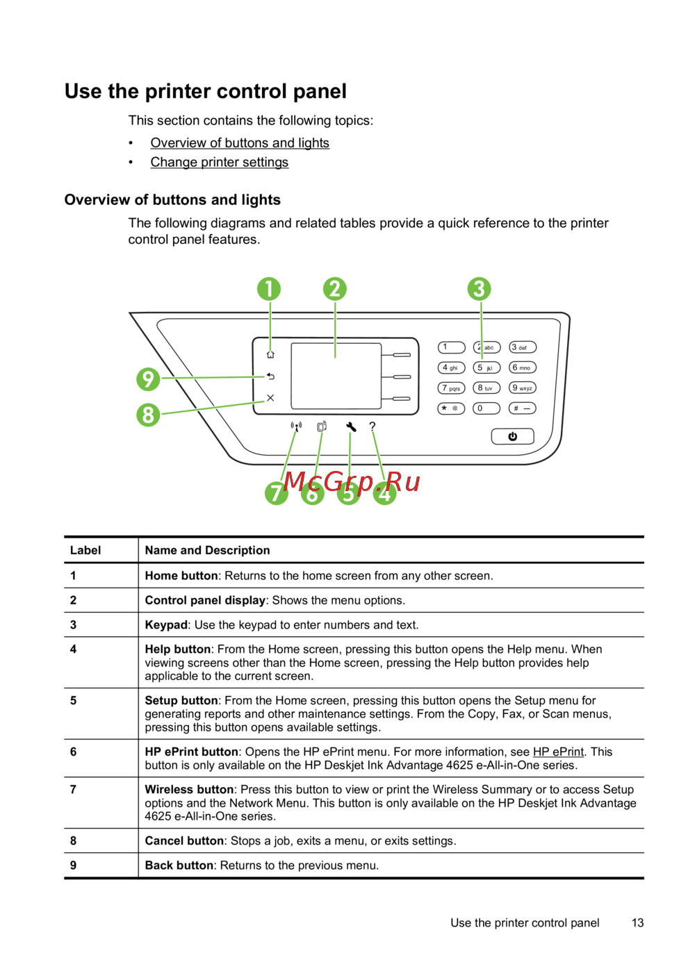 6 HP ePrint button: Opens the HP ePrint menu. For more information, see