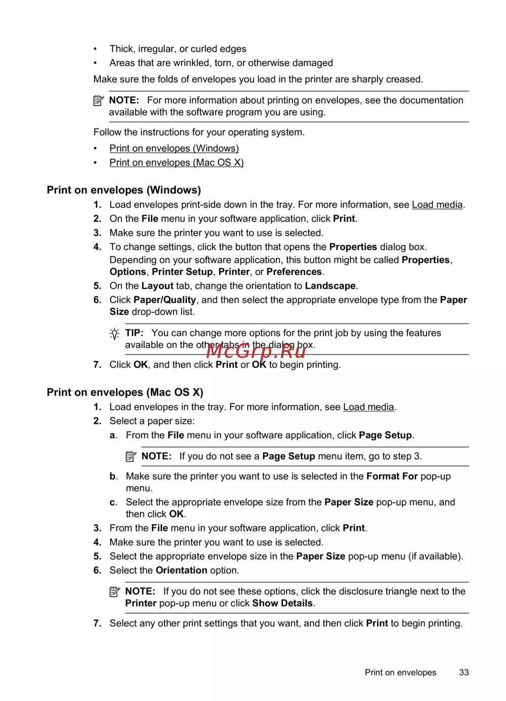 1. Load envelopes print-side down in the tray. For more information, see Load media.