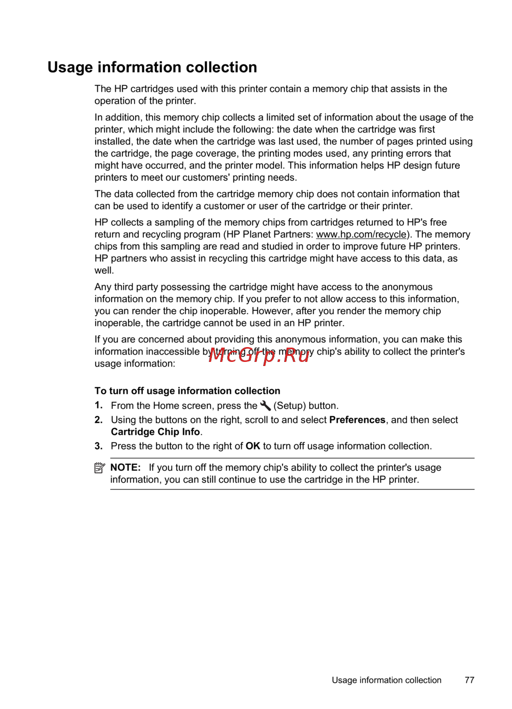 NOTE: If you turn off the memory chip's ability to collect the printer's usage