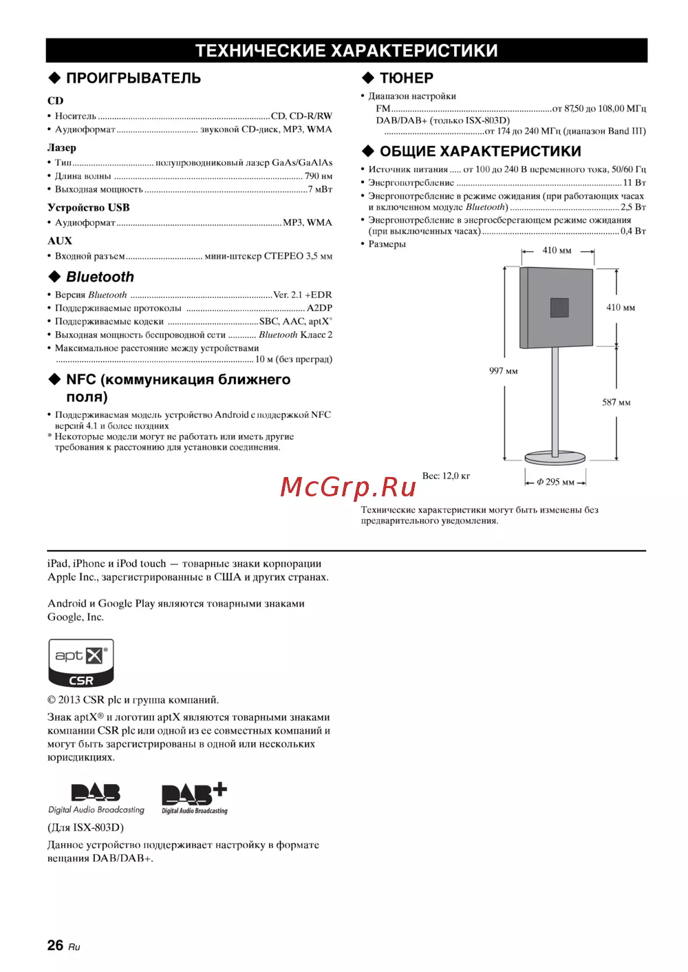 ТЕХНИЧЕСКИЕ ХАРАКТЕРИСТИКИ ПРОИГРЫВАТЕЛЬ CD Носитель CD CD R RW Аудиоформат звуковой CD диск MP3 WMA Лазер Тип полупроводниковый лазер GaAs GaAlAs Длина волны 790 нм Выходная мощность 7 мВт Устройство USB Аудиоформат MP3 WMA AUX ТЮНЕР Диапазон настройки FM от 87 50 до 108 00 МГц DAB DAB только ISX 803D от 174 до 240 МГц диапазон Band III ОБЩИЕ ХАРАКТЕРИСТИКИ Ист очник низ ания от 100 до 240 В переменного тока 50 60 Гц Энергопотребление 11 Вт Энергопотребление в режиме ожидания при работающих часах и включенном модуле Bluetooth 2 5 Вт Энергопотребление в энергосберегающем режиме ожидания при выключенных часах Размеры Входной разъем мини штекер СТЕРЕО 3 5 мм Bluetooth Версия Bluetooth Ver 2 1 EDR Поддерживаемые протоколы A2DP Поддерживаемые кодеки SBC ААС aptX Выходная мощность беспроводной сети Bluetooth Класс 2 Максимальное расстояние между устройст вами 10 м без преград NFC коммуникация ближнего поля Поддерживаемая модель устройство Android с поддержкой NFC версий 4 1 и более поздних Некоторые модели могут нс работать или иметь другие требования к расстоянию для установки соединения Вес 12 0 кг Технические характеристики могут быть изменены без предварительного уведомления iPad iPhone и iPod touch товарные знаки корпорации Apple Inc зарегистрированные в США и других странах Android и Google Play являются товарными знаками Google Inc laptSj CSR 2013 CSR plc и группа компаний Знак aptX и логотип aptX являются товарными знаками компании CSR plc или одной из сс совместных компаний и могут быть зарегистрированы в одной или нескольких юрисдикциях В4В В В Digital Audio Broadcasting Digital Audio Brosdanting Для ISX 803D Данное устройство поддерживает настройку в формате вещания DAB DAB 26 Ru