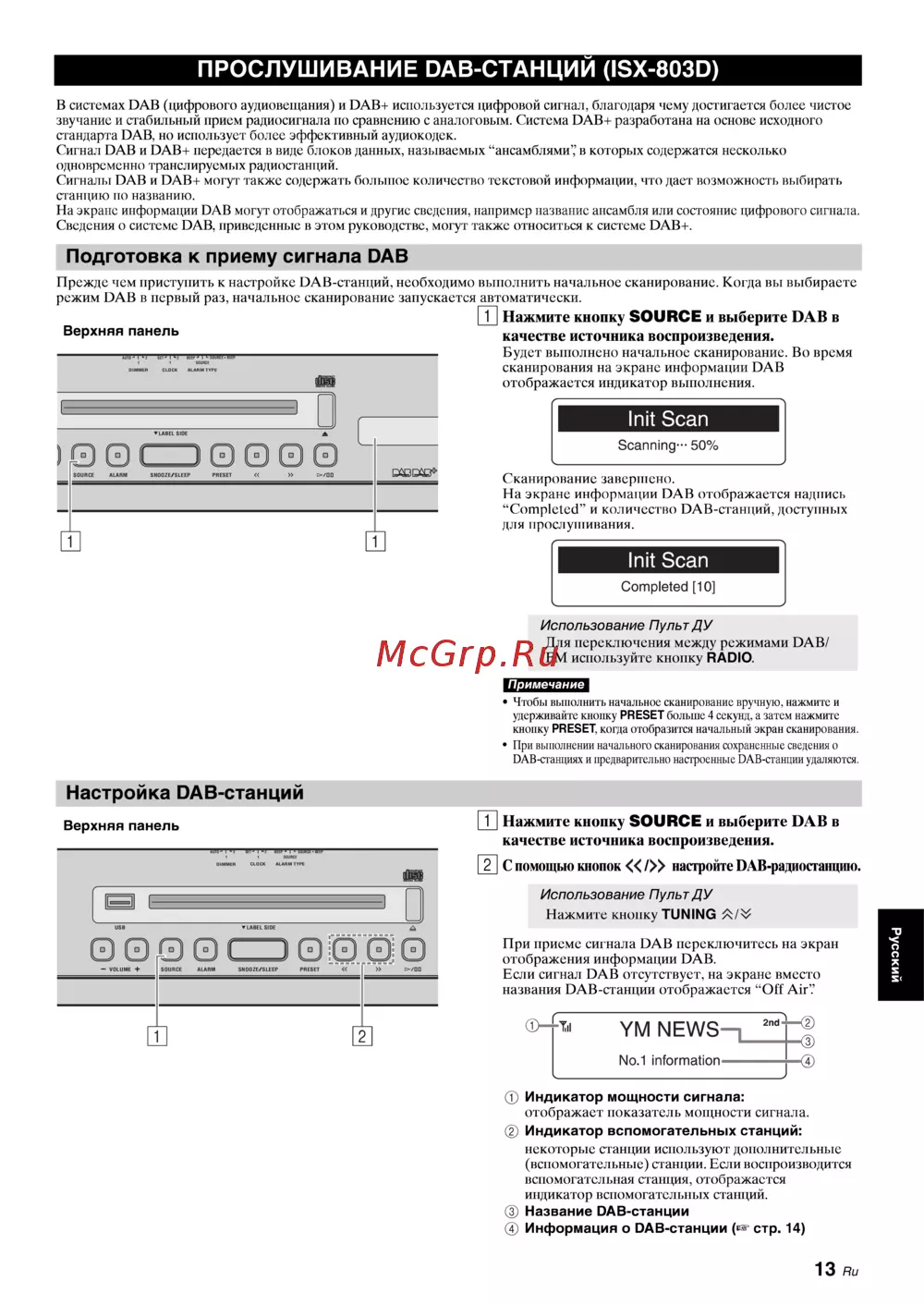ПРОСЛУШИВАНИЕ DAB СТАНЦИЙ ISX 803D В системах DAB цифрового аудиовещания и DAB используется цифровой сигнал благодаря чему достигается более чистое звучание и стабильный прием радиосигнала по сравнению с аналоговым Система DAB разработана на основе исходного стандарта DAB но использует более эффективный аудиокодек Сигнал DAB и DAB передастся в виде блоков данных называемых ансамблями в которых содержатся несколько одновременно транслируемых радиостанций Сигналы DAB и DAB могут также содержать большое количество текстовой информации что даст возможность выбирать станцию по названию На экране информации DAB могут отображаться и другие сведения например название ансамбля или состояние цифрового сигнала Сведения о системе DAB приведенные в этом руководстве могут также относиться к системе DAB Подготовка к приему сигнала DAB Прежде чем приступить к настройке DAB станций необходимо выполнить начальное сканирование Когда вы выбираете режим DAB в первый раз начальное сканирование запускается автоматически ГП Нажмите кнопку SOURCE и выберите DAB в качестве источника воспроизведения Будет выполнено начальное сканирование Во время сканирования на экране информации DAB отображается индикатор выполнения Init Scan Scanning 50 Сканирование завершено На экране информации DAB отображается надпись Completed и количество DAB станций доступных для прослушивания Init Scan Completed 10 Использование Пульт ДУ Для переключения между режимами DAB FM используйте кнопку RADIO Примечание Чтобы выполнить начальное сканирование вручную нажмите и удерживайте кнопку PRESET больше 4 секунд а затем нажмите кнопку PRESET когда отобразится начальный экран сканирования При выполнении начального сканирования сохраненные сведения о DAB станциях и предварительно настроенные DAB станции удаляются Русский Индикатор мощности сигнала отображает показатель мощности сигнала Индикатор вспомогательных станций некоторые станции используют дополнительные вспомогательные станции Если воспроизводится вспомогательная станция отображается индикатор вспомогательных станций Название ОАВ станции Информация о ОАВ станции стр 14 13 Ru