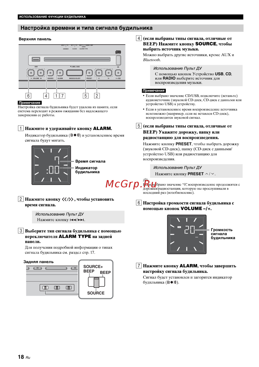 ИСПОЛЬЗОВАНИЕ ФУНКЦИИ БУДИЛЬНИКА Настройка времени и типа сигнала будильника 4 если выбраны типы сигнала отличные от ВЕЕР Нажмите кнопку SOURCE чтобы выбрать источник музыки Можно выбрать другие источники кроме AUX и Bluetooth Верхняя панель Использование Пульт ДУ С помощью кнопок Устройство USB CD или RADIO выберите источник для воспроизведения музыки Примечания Примечание Настройка сигнала будильника будет удалена из памяти если система переходит в режим ожидания без надлежащего завершения се работы ГП Нажмите и удерживайте кнопку ALARM Индикатор будильника Н П и установленное время сигнала будут мигать I Время сигнала Если выбрано значение CD USB подключите вставьте аудиоисточник звуковой CD диск CD диск с данными или устройство USB к устройству Если в установленное время воспроизведение источника невозможно например если не вставлен CD диск воспроизводится звуковой сигнал 5 если выбраны типы сигнала отличные от ВЕЕР Укажите дорожку папку или радиостанцию для воспроизведения Нажмите кнопку PRESET чтобы выбрать дорожку звуковой CD диск папку CD диск сданными устройство USB или радиостанцию для воспроизведения Индикатор будильника I Использование Пульт ДУ Нажмите кнопку PRESET л v Ф Если выбрано значение воспроизведение продолжится с дорожки радиостанции которую вы прослушивали в последний раз возобновление 2 Нажмите кнопку чтобы установить время сигнала Гб Настройка громкости сигнала будильника с помощью кнопок VOLUME Использование Пульт ДУ Нажмите кнопку ГП Выберите тип сигнала будильника с помощью переключателя ALARM TYPE на задней панели Для получения подробной информации о типах сигнала будильника см раздел стр 17 Г ром кость сигнала будильника ГП Нажмите кнопку ALARM чтобы завершить настройку сигнала будильника Сигнал будет установлен и загорится индикатор будильника 1 8 Ru
