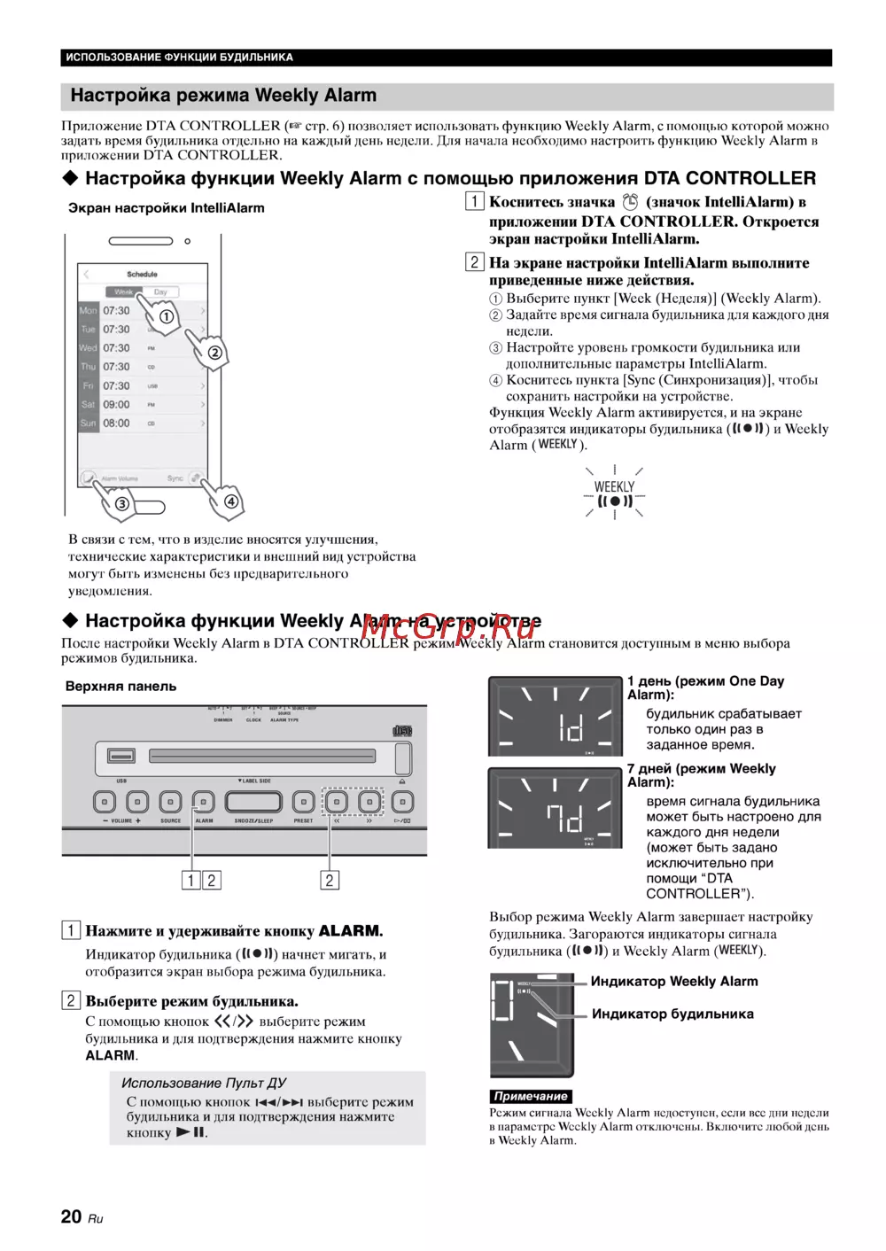 ИСПОЛЬЗОВАНИЕ ФУНКЦИИ БУДИЛЬНИКА Настройка режима Weekly Alarm Приложение DTA CONTROLLER стр 6 позволяет использовать функцию Weekly Alarm с помощью которой можно задать время будильника отдельно на каждый день недели Для начала необходимо настроить функцию Weekly Alarm в приложении DTA CONTROLLER Настройка функции Weekly Alarm с помощью приложения DTA CONTROLLER Экран настройки IntelliAlarm ГП Коснитесь значка значок IntelliAlarm в приложении DTA CONTROLLER Откроется экран настройки IntelliAlarm ПИ На экране настройки IntelliAlarm выполните приведенные ниже действия Выберите пункт Wcck Неделя Weekly Alarm Задайте время сигнала будильника для каждого дня недели Настройте уровень громкости будильника или дополнительные параметры InlelliAlarm Коснитесь пункта Sync Синхронизация чтобы сохранить настройки на устройстве Функция Weekly Alarm активируется и па экране отобразятся индикаторы будильника и Weekly Alarm WEEKLY NI WEEKLY iieir IN В связи с тем что в изделие вносятся улучшения технические характеристики и внешний вид устройства могут быть изменены без предварительного уведомления Настройка функции Weekly Alarm на устройстве После настройки Weekly Alarm в DTA CONTROLLER режим Weekly Alarm становится доступным в меню выбора режимов будильника 1 день режим One Day Alarm будильник срабатывает только один раз в заданное время 7 дней режим Weekly Alarm время сигнала будильника может быть настроено для каждого дня недели может быть задано исключительно при помощи DTA CONTROLLER ГП Нажмите и удерживайте кнопку ALARM Индикатор будильника 11 11 начнет мигать и отобразится экран выбора режима будильника Выбор режима Weekly Alarm завершает настройку будильника Загораются индикаторы сигнала будильника и Weekly Alarm WEEKLY Индикатор Weekly Alarm 2 Выберите режим будильника С помощью кнопок выберите режим будильника и для подтверждения нажмите кнопку ALARM Использование Пульт ДУ С помощью кнопок выберите режим будильника и для подтверждения нажмите кнопку II 20 Ru В Индикатор будильника Примечание Режим сигнала Weekly Alarm недоступен если все дни недели в параметре Weekly Alarm отключены Включите любой день в Weekly Alarm