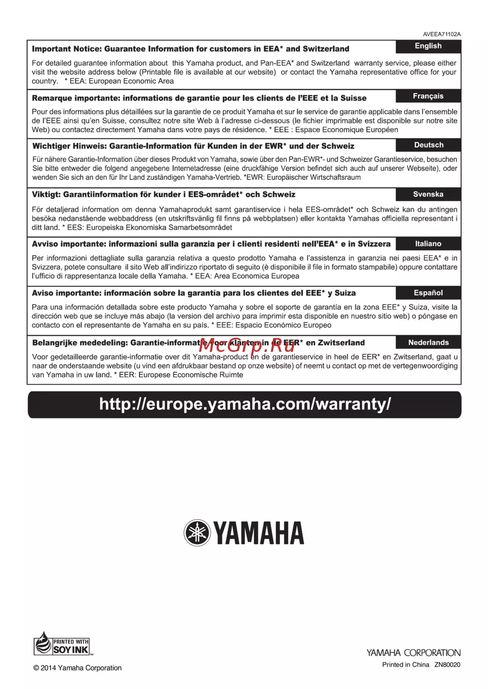 AVEEA71102A Important Notice Guarantee Information for customers in EEA and Switzerland For detailed guarantee information about this Yamaha product and Pan EEA and Switzerland warranty service please either visit the website address below Printable file is available at our website or contact the Yamaha representa tive office for your country EEA European Economic Area Remarque importante informations de garantie pour les clients de I EEE et la Suisse Pour des informations plus détaillées sur la garantie de ce produit Yamaha et sur le service de garantie applicab le dans l ensemble de l EEE ainsi qu en Suisse consultez notre site Web à l adresse ci dessous le fichier imprimable est dispo nible sur notre site Web ou contactez directement Yamaha dans votre pays de résidence EEE Espace Economique Europée Wichtiger Hinweis Garantie Information für Kunden in der EWR und der Schweiz Für nähere Garantie Information über dieses Produkt von Yamaha sowie über den Pan EWR und Schweizer Garant eservice besuchen Sie bitte entweder die folgend angegebene Intemetadresse eine druckfähige Version befindet sich auch auf unse rer Webseite oder wenden Sie sich an den für Ihr Land zuständigen Yamaha Vertrieb EWR Europäischer Wirtschaftsraum Viktigt Garantiinformation för kunder i EES omrädet och Schweiz För detaljerad information om denna Yamahaprodukt samt garantiservice i heia EES omrädet och Schwei z kan du antingen besöka nedanstàende webbaddress en utskriftsvänlig f I finns pä webbplatsen eller kontakta Yamahas offic ella représentant i ditt land EES Europeiska Ekonomiska Samarbetsomrädet Awiso importante informazioni sulla garanzia per i clienti resident nell EEA e in Svizzera Per informazioni dettagliate sulla garanzia relativa a questo prodotto Yamaha e l assistenza in garanzia ne i paesi EEA e in Svizzera potete consultare il sito Web all indirizzo riportato di seguito é disponibile I file in formato stampabile oppure contattare l ufficio di rappresentanza locale della Yamaha EEA Area Económica Europea Aviso importante información sobre la garantía para los clientes del EEE y Suiza Para una información detallada sobre este producto Yamaha y sobre el soporte de garantía en la zona EEE y Suiza visite la dirección web que se incluye más abajo la version del archivo para imprimir esta disponible en nuestro sitio veb o póngase en contacto con el representante de Yamaha en su país EEE Espacio Económico Europeo Belangrijke mededeling Garantie informatie voor klanten in de EER en Zwitserland Voor gedetailleerde garantie informatie over dit Yamaha product en de garantieservice in heel de EER en twitserland gaat u naar de onderstaande website u vind een afdrukbaar bestand op onze website of neemt u contact op met de v ertegenwoordiging van Yamaha in uw land EER Europese Economische Ruimte http europe yamaha com warranty YAMAHA PRINTED WITH I ISOYINK 2014 Yamaha Corporation YAMAHA CORPORATION Printed in China ZN80020