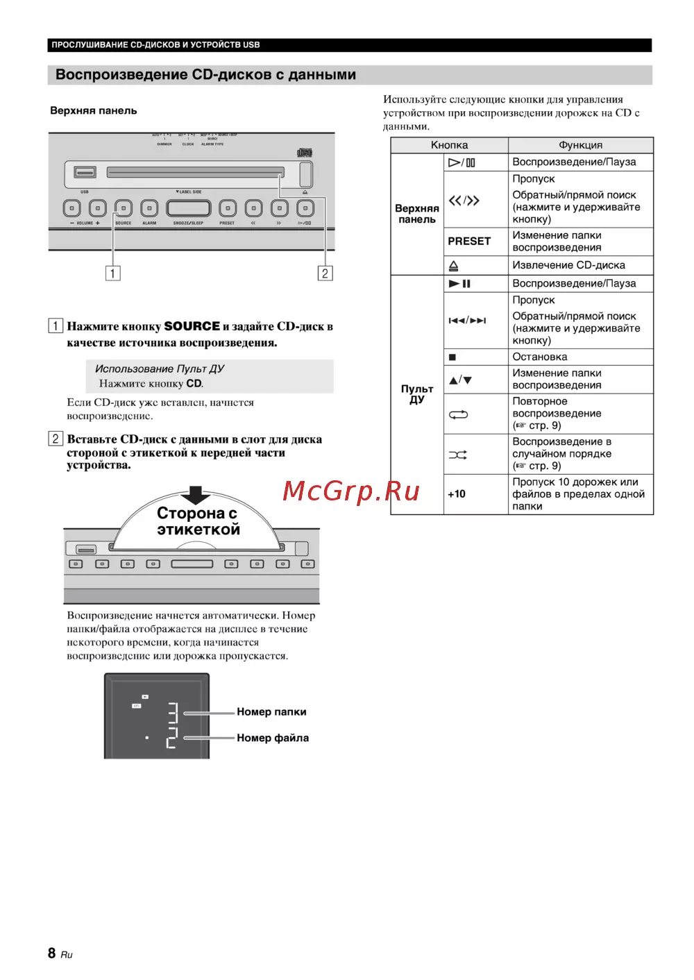 ПРОСЛУШИВАНИЕ CD ДИСКОВ И УСТРОЙСТВ USB Воспроизведение CD дисков с данными Используйте следующие кнопки для управления устройством при воспроизведении дорожек на СО с данными Верхняя панель Кнопка 00 Функция Воспроизведение Пауза Пропуск Верхняя панель Обратный прямой поиск нажмите и удерживайте кнопку PRESET Изменение папки воспроизведения А Извлечение СО диска II Воспроизведение Пауза Пропуск ГП Нажмите кнопку SOURCE и задайте CD диск в ш Обратный прямой поиск нажмите и удерживайте кнопку Остановка Изменение папки воспроизведения О Повторное воспроизведение стр 9 с Воспроизведение в случайном порядке иг стр 9 10 Пропуск 10 дорожек или файлов в пределах одной папки качестве источника воспроизведения Использование Пульт ДУ Нажмите кнопку СО Пульт ДУ Если СВ диск уже вставлен начнется воспроизведение 21 Вставьте СО диск с данными в слот для диска стороной с этикеткой к передней части устройства Воспроизведение начнется автоматически Номер папки файла отображается на дисплее в течение некоторого времени когда начинается воспроизведение или дорожка пропускается Номер папки Номер файла 8 Ru
