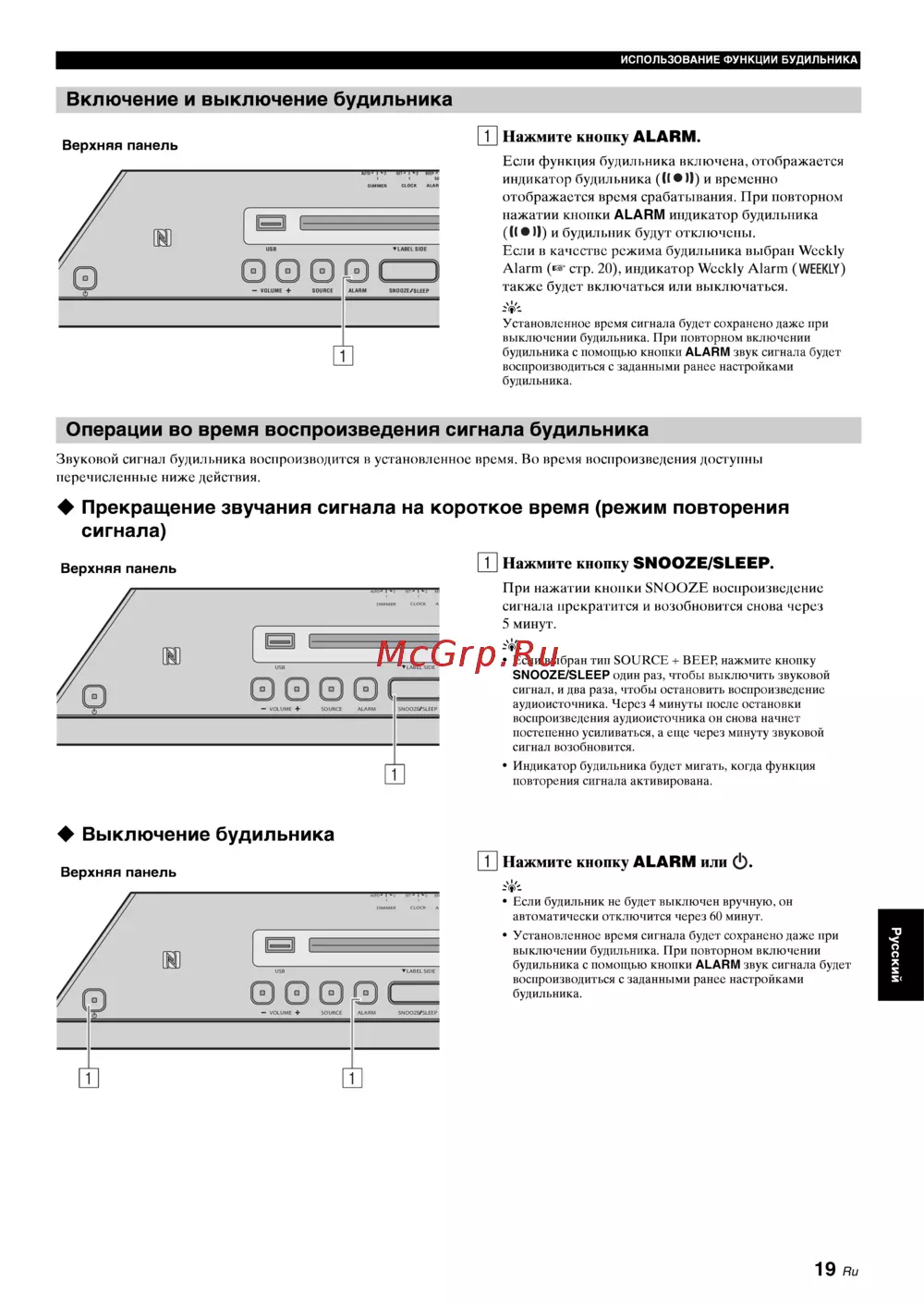 ИСПОЛЬЗОВАНИЕ ФУНКЦИИ БУДИЛЬНИКА Включение и выключение будильника Верхняя панель ГП Нажмите кнопку ALARM Если функция будильника включена отображается индикатор будильника 1 11 и временно отображается время срабатывания При повторном нажатии кнопки ALARM индикатор будильника II и будильник будут отключены Если в качестве режима будильника выбран Weekly Alarm к стр 20 индикатор Weekly Alarm WEEKLY также будет включаться или выключаться Установленное время сигнала будет сохранено даже при выключении будильника При повторном включении будильника с помощью кнопки ALARM звук сигнала будет воспроизводиться с заданными ранее настройками будильника Операции во время воспроизведения сигнала будильника Звуковой сигнал будильника воспроизводится в установленное время Во время воспроизведения доступны перечисленные ниже действия Прекращение звучания сигнала на короткое время режим повторения сигнала Верхняя панель Ш Нажмите кнопку SNOOZE SLEEP При нажатии кнопки SNOOZE воспроизведение сигнала прекратится и возобновится снова через 5 минут Если выбран тип SOURCE ВЕЕР нажмите кнопку SNOOZE SLEEP один раз чтобы выключить звуковой сигнал и два раза чтобы остановить воспроизведение аудиоисточника Через 4 минуты после остановки воспроизведения аудиоисточника он снова начнет постепенно усиливаться а еще через минуту звуковой сигнал возобновится Индикатор будильника будет мигать когда функция повторения сигнала активирована Выключение будильника Верхняя панель ГП Нажмите кнопку ALARM или ф Если будильник нс будет выключен вручную он автоматически отключится через 60 минут Русский Установленное время сигнала будет сохранено даже при выключении будильника При повторном включении будильника с помощью кнопки ALARM звук сигнала будет воспроизводиться с заданными ранее настройками будильника 19 Ru