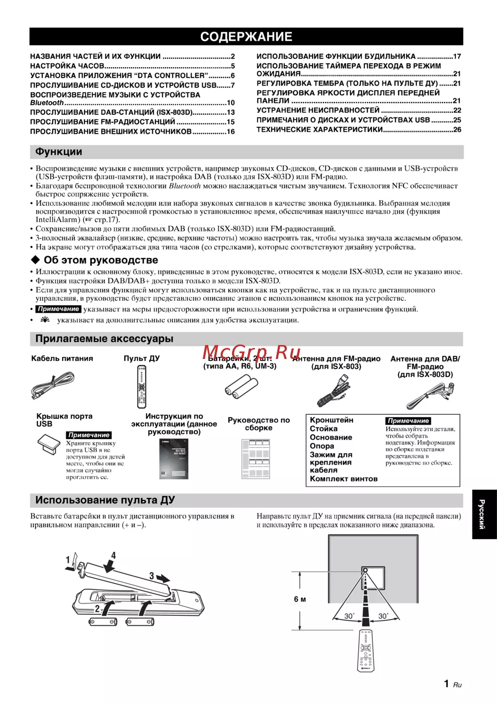 СОДЕРЖАНИЕ НАЗВАНИЯ ЧАСТЕЙ И ИХ ФУНКЦИИ 2 НАСТРОЙКА ЧАСОВ 5 УСТАНОВКА ПРИЛОЖЕНИЯ DTA CONTROLLER 6 ПРОСЛУШИВАНИЕ CD ДИСКОВ И УСТРОЙСТВ USB 7 ВОСПРОИЗВЕДЕНИЕ МУЗЫКИ С УСТРОЙСТВА Bluetooth 10 ПРОСЛУШИВАНИЕ DAB СТАНЦИЙ ISX 803D 13 ПРОСЛУШИВАНИЕ FM РАДИОСТАНЦИЙ 15 ПРОСЛУШИВАНИЕ ВНЕШНИХ ИСТОЧНИКОВ 16 ИСПОЛЬЗОВАНИЕ ФУНКЦИИ БУДИЛЬНИКА 17 ИСПОЛЬЗОВАНИЕ ТАЙМЕРА ПЕРЕХОДА В РЕЖИМ ОЖИДАНИЯ 21 РЕГУЛИРОВКА ТЕМБРА ТОЛЬКО НА ПУЛЬТЕ ДУ 21 РЕГУЛИРОВКА ЯРКОСТИ ДИСПЛЕЯ ПЕРЕДНЕЙ ПАНЕЛИ 21 УСТРАНЕНИЕ НЕИСПРАВНОСТЕЙ 22 ПРИМЕЧАНИЯ О ДИСКАХ И УСТРОЙСТВАХ USB 25 ТЕХНИЧЕСКИЕ ХАРАКТЕРИСТИКИ 26 Функции Воспроизведение музыки с внешних устройств например звуковых CD дисков CD дисков с данными и USB устройств USB устройств флэш памяти и настройка DAB только для ISX 803D или FM радио Благодаря беспроводной технологии Bluetooth можно наслаждаться чистым звучанием Технология NFC обеспечивает быстрое сопряжение уст ройств Использование любимой мелодии или набора звуковых сигналов в качестве звонка будильника Выбранная мелодия воспроизводится с настроенной громкостью в установленное время обеспечивая наилучшсс начало дня функция Intelli Alarm стр 17 Сохранснис вызов до пяти любимых DAB только ISX 803D или FM радиостанций 3 полосный эквалайзер низкие средние верхние частоты можно настроить так чтобы музыка звучала желаемым образом На экране могут отображаться два типа часов со стрелками которые соответствуют дизайну устройства Об этом руководстве Иллюстрации к основному блоку приведенные в этом руководстве относятся к модели 18Х 803О если нс указано иное Функция настройки ОАВ ОАВт доступна только в модели 15Х 803О Если для управления функцией могут использоваться кнопки как па устройстве так и па пульте дистанционного управления в руководстве будет представлено описание этапов с использованием кнопок на устройстве Примечание указывает на меры предосторожности при использовании устройства и ограничения функций указывает на дополнительные описания для удобства эксплуатации Прилагаемые аксессуары Пульт ДУ Батарейки 2 шт типа ДА R6 UM 3 Антенна для FM радио для ISX 803 Антенна для DAB FM радио для ISX 803D Крышка порта USB Примечание Храните крышку порта USB в нс доступном для детей месте чтобы они не могли случайно проглотить се Инструкция по эксплуатации данное руководство Руководство по сборке Кронштейн Стойка Основание Опора Зажим для крепления кабеля Комплект винтов Примечание Используйте эти детали чтобы собрать подставку Информация по сборке полставки представлена в руководстве по сборке Вставьте батарейки в пульт дистанционного управления в правильном направлении и Направьте пульт ДУ на приемник сигнала на передней панели и используйте в пределах показанного ниже диапазона т 1 6м 1 RU Русский Использование пульта ДУ