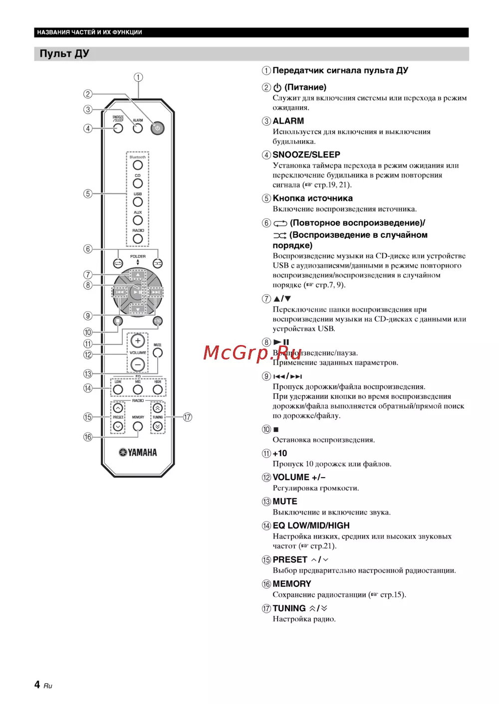 НАЗВАНИЯ ЧАСТЕЙ И ИХ ФУНКЦИИ Пульт ДУ Передатчик сигнала пульта ДУ ф Питание Служит для включения системы или перехода в режим ожидания ALARM Используется для включения и выключения будильника SNOOZE SLEEP Установка таймера перехода в режим ожидания или переключение будильника в режим повторения сигнала стр 19 21 Кнопка источника Включение воспроизведения источника qzD Повторное воспроизведение в случайном ZC Воспроизведение порядке Воспроизведение музыки на CD диске или устройстве USB с аудиозаписями данпыми в режиме повторного воспроизведения воспроизведсния в случайном порядке стр 7 9 Л Т Переключение папки воспроизведения при воспроизведении музыки на CD дисках сданными или устройствах USB II Воспроизвсдснис пауза Применение заданных параметров М4 Пропуск дорожки файла воспроизведения При удержании кнопки во время воспроизведения дорожки файла выполняется обратный прямой поиск по дорожке файлу Остановка воспроизведения 10 Пропуск 10 дорожек или файлов VOLUME Регулировка громкости MUTE Выключение и включение звука EQ LOW MID HIGH Настройка низких средних или высоких звуковых частот а стр 21 PRESET Выбор предварительно настроенной радиостанции MEMORY Сохранение радиостанции стр 15 TUNING Л Настройка радио 4 Ru