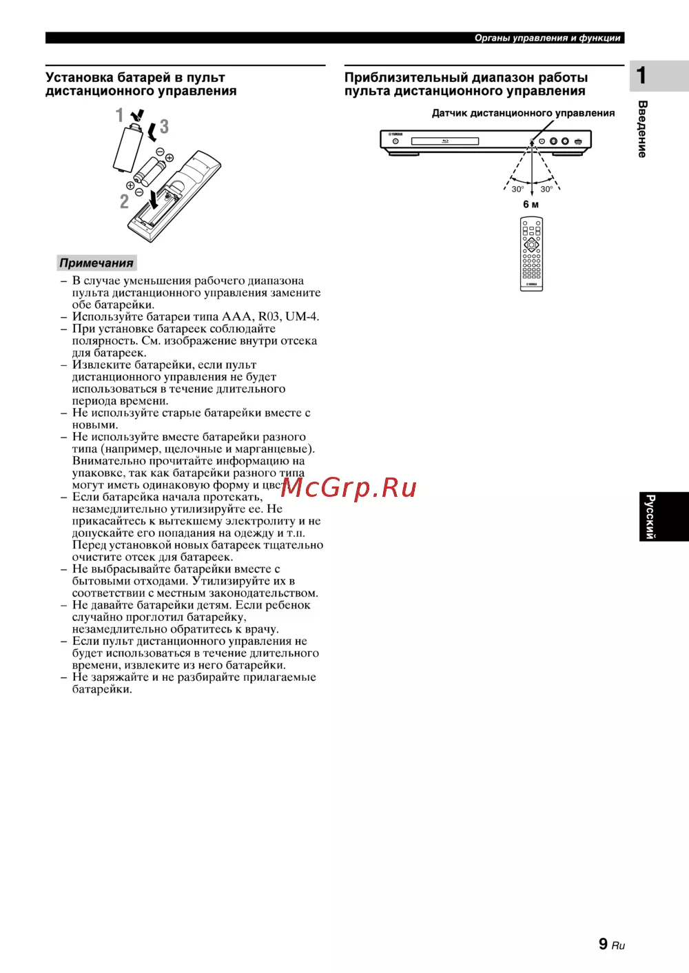 Органы управления и функции Установка батарей в пульт дистанционного управления Приблизительный диапазон работы пульта дистанционного управления Введение Датчик дистанционного управления Примечания В случае уменьшения рабочего диапазона пульта дистанционного управления замените обе батарейки Используйте батареи типа ААА КОЗ НМ 4 При установке батареек соблюдайте полярность См изображение внутри отсека для батареек Извлеките батарейки если пульт дистанционного управления нс будет использоваться в течение длительного периода времени Не используйте старые батарейки вместе с новыми Не используйте вместе батарейки разного типа например щелочные и марганцевые Внимательно прочитайте информацию на упаковке так как батарейки разного типа могут иметь одинаковую форму и цвет Если батарейка начала протекать незамедлительно утилизируйте се Нс прикасайтесь к вытекшему электролиту и не допускайте его попадания на одежду и т п Перед установкой новых батареек тщательно очистите отсек для батареек Не выбрасывайте батарейки вместе с бытовыми отходами Утилизируйте их в соответствии с местным законодательством Нс давайте батарейки детям Если ребенок случайно проглотил батарейку незамедлительно обратитесь к врачу Если пульт дистанционного управления не будет использоваться в течение длительного времени извлеките из него батарейки Не заряжайте и не разбирайте прилагаемые батарейки 9 Ни