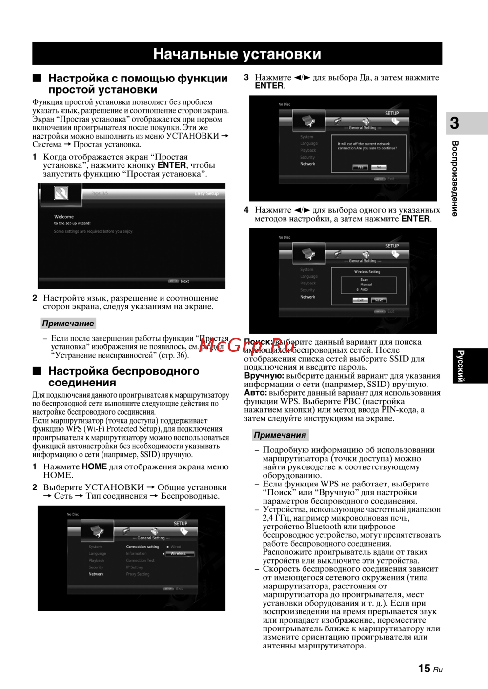 Начальные установки Настройка с помощью функции простой установки 3 Нажмите для выбора Да а затем нажмите ENTER Функция простой установки позволяет без проблем указать язык разрешение и соотношение сторон экрана Экран Простая установка отображается при первом включении проигрывателя после покупки Эти же настройки можно выполнить из меню УСТАНОВКИ Система Простая установка 3 Воспроизведение 1 Когда отображается экран Простая установка нажмите кнопку ENTER чтобы запустить функцию Простая установка 4 Нажмите для выбора одного из указанных методов настройки а затем нажмите ENTER 2 Настройте язык разрешение и соотношение сторон экрана следуя указаниям на экране Примечание Если после завершения работы функции Простая установка изображения нс появилось см раздел Устранение неисправностей стр 36 Настройка беспроводного соединения Для подключения данного проигрывателя к маршрутизатору по беспроводной сети выполните следующие действия по настройке беспроводного соединения Если маршрутизатор точка доступа поддерживает функцию WPS Wi Fi Protected Setup для подключения проигрывателя к маршрутизатору можно воспользоваться функцией автонастройки без необходимости указывать информацию о сети например SSID вручную 1 Нажмите НОМЕ для отображения экрана меню НОМЕ 2 Выберите УСТАНОВКИ Общие установки Сеть Тип соединения Беспроводные Поиск выберите данный вариант для поиска имеющихся беспроводных сетей После отображения списка сетей выберите SSID для подключения и введите пароль Вручную выберите данный вариант для указания информации о сети например SSID вручную Авто выберите данный вариант для использования функции WPS Выберите РВС настройка нажатием кнопки или метод ввода PIN кода а затем следуйте инструкциям на экране Примечания Подробную информацию об использовании маршрутизатора точки доступа можно найти руководстве к соответствующему оборудованию Если функция WPS не работает выберите Поиск или Вручную для настройки параметров беспроводного соединения Устройства использующие частотный диапазон 2 4 ГГц например микроволновая печь устройство Bluetooth или цифровое беспроводное устройство могут препятствовать работе беспроводного соединения Расположите проигрыватель вдали от таких устройств или выключите эти устройства Скорость беспроводного соединения зависит от имеющегося сетевого окружения типа маршрутизатора расстояния от маршрутизатора до проигрывателя мест установки оборудования и т д Если при воспроизведении на время прерывается звук или пропадает изображение переместите проигрыватель ближе к маршрутизатору или измените ориентацию проигрывателя или антенны маршрутизатора 15 Ru