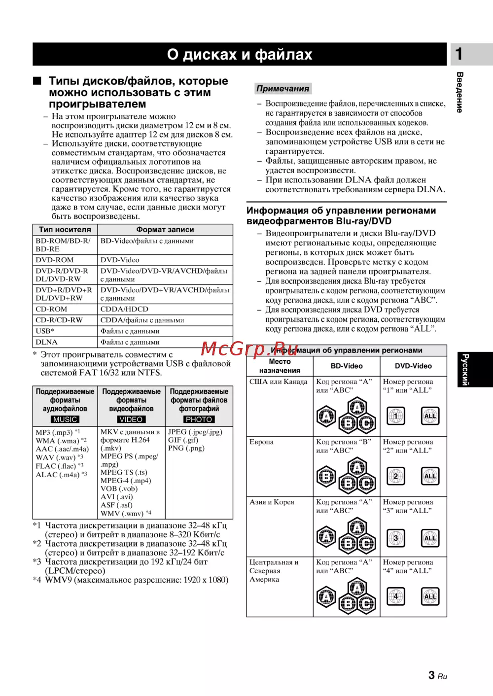 1 О дисках и файлах На этом проигрывателе можно воспроизводить диски диаметром 12 см и 8 см Не используйте адаптер 12 см для дисков 8 см Используйте диски соответствующие совместимым стандартам что обозначается наличием официальных логотипов на этикетке диска Воспроизведение дисков не соответствующих данным стандартам не гарантируется Кроме того не гарантируется качество изображения или качество звука даже в том случае если данные диски могут быть воспроизведены Тип носителя BD ROM BD R BD RE Формат записи BD Vidco файлы с данными DVD ROM DVD Video DVD R DVD R DUDVD RW DVD Video DVD VR AVCHD файлы с данными DVD R DVD R DUDVD RW DVD Video DVD VR AVCHD файлы с данными CD ROM CDDA HDCD CD R CD RW CDDA файлы с данными USB Файлы с данными DLNA Файлы сданными Этот проигрыватель совместим с запоминающими устройствами USB с файловой системой FAT 16 32 или NTFS Примечания Воспроизведение файлов перечисленных в списке нс гарантируется в зависимости от способов создания файла или использованных кодеков Воспроизведение всех файлов на диске запоминающем устройстве USB или в сети не гарантируется Файлы защищенные авторским правом нс удастся воспроизвести При использовании DLNA файл должен соответствовать требованиям сервера DLNA Информация об управлении регионами видеофрагментов Blu ray DVD Видеопроигрыватели и диски Blu ray DVD имеют региональные коды определяющие регионы в которых диск может быть воспроизведен Проверьте метку с кодом региона на задней панели проигрывателя Для воспроизведения диска Blu ray требуется проигрыватель с кодом региона соответствующим коду региона диска или с кодом региона АВС Для воспроизведения диска DVD требуется проигрыватель с кодом региона соответствующим коду региона диска или с кодом региона ALL Информация об управлении регионами Место назначения США или Канада Поддерживаемые форматы аудиофайлов Поддерживаемые форматы видеофайлов Код региона А или АВС DVD Video Номер региона 1 или ALL gw ALL liDIM ГДГДЯ MP3 mp3 1 WMA wma 2 ЛАС аас т4а WAV wav 3 FLAC flac 3 ALAC т4а 3 Поддерживаемые форматы файлов фотографий В D Video MKV с данными в формате Н 264 mkv MPEG PS mpeg mpg MPEG TS ls MPEG 4 mp4 VOB vob AVI avi ASF asf WMV wmv 4 JPEG jpeg jpg GIF gif PNG png 1 Частота дискретизации в диапазоне 32 48 кГц стерео и битрейт в диапазоне 8 320 Кбит с 2 Частота дискретизации в диапазоне 32 48 кГц стерео и битрейт в диапазоне 32 192 Кбит с 3 Частота дискретизации до 192 кГц 24 бит ЬРСМ стерео 4 WMV9 максимальное разрешение 1920 х 1080 Европа Код региона В или АВС Номер региона 2 или ALL ALL Азия и Корея Код региона А или АВС 0 Центральная и Северная Америка Код региона А или АВС Номер региона 3 или ALL 3 ALL Номер региона 4 или ALL ы 3 Ru Введение Типы дисков файлов которые можно использовать с этим проигрывателем