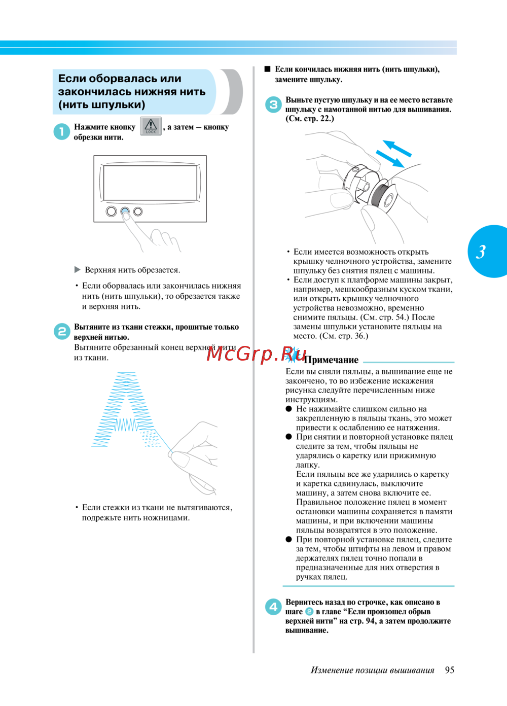 ■ Если кончилась нижняя нить (нить шпульки),