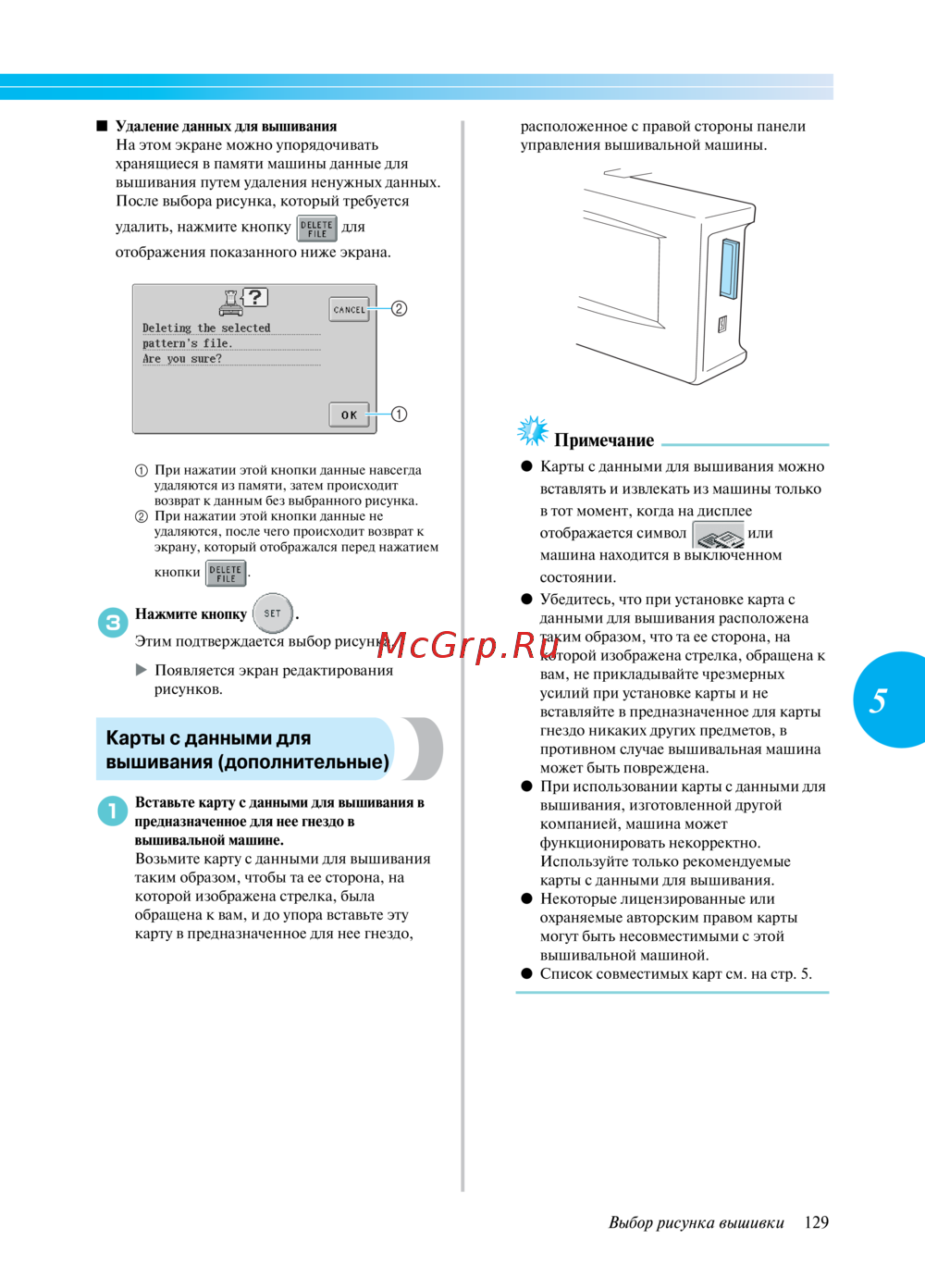 - Обращение с дополнительными картами на которых хранятся данные для вышивания p.7