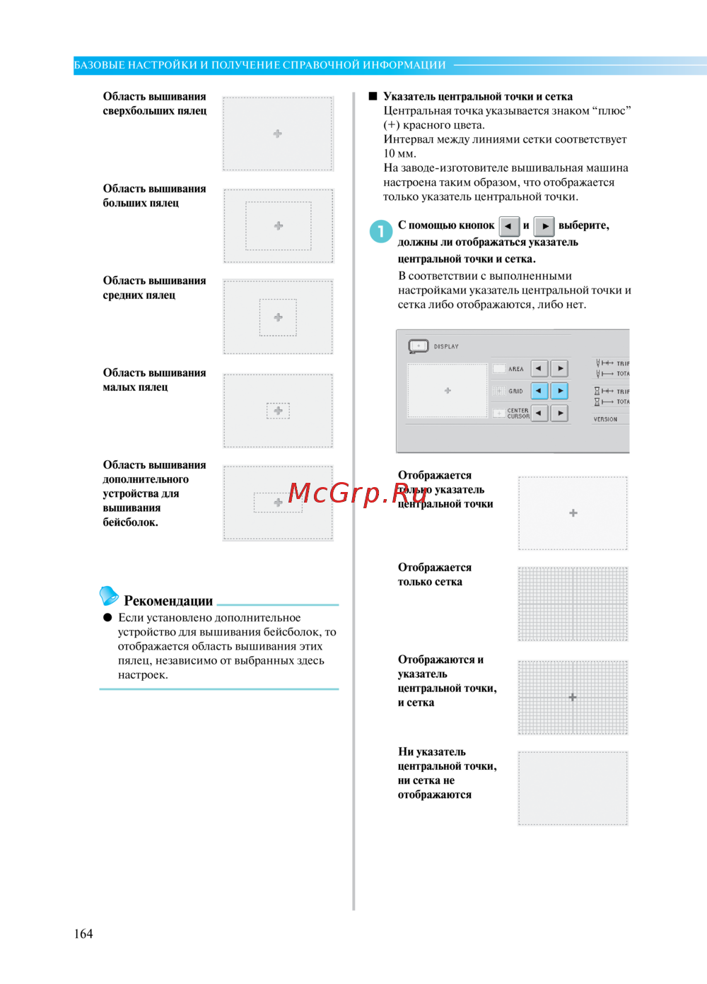 Узнайте о базовых настройках вышивальной машины и области вышивания для различных пялец. Получите советы по отображению указателя центральной точки и сетки.