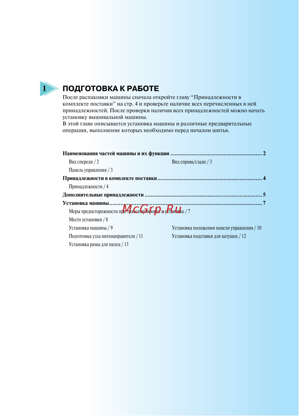 Узнайте, как правильно подготовить вышивальную машину к работе. Проверьте комплектующие, установите машину и выполните необходимые предварительные операции.