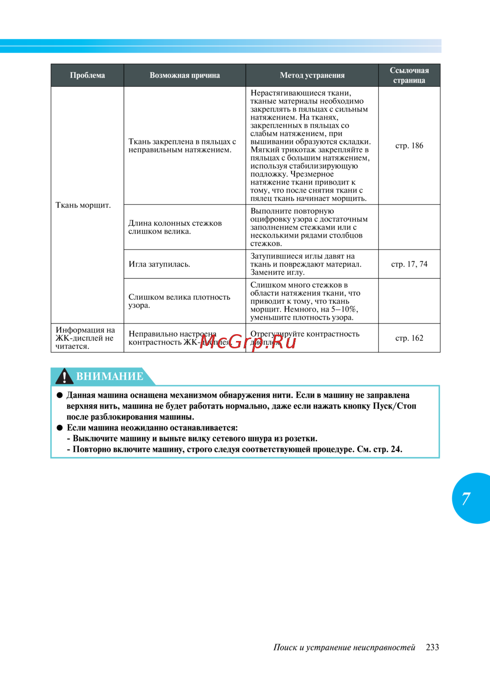 Brother PR-600IIC — поиск и устранение неисправностей при вышивании тканей [252]