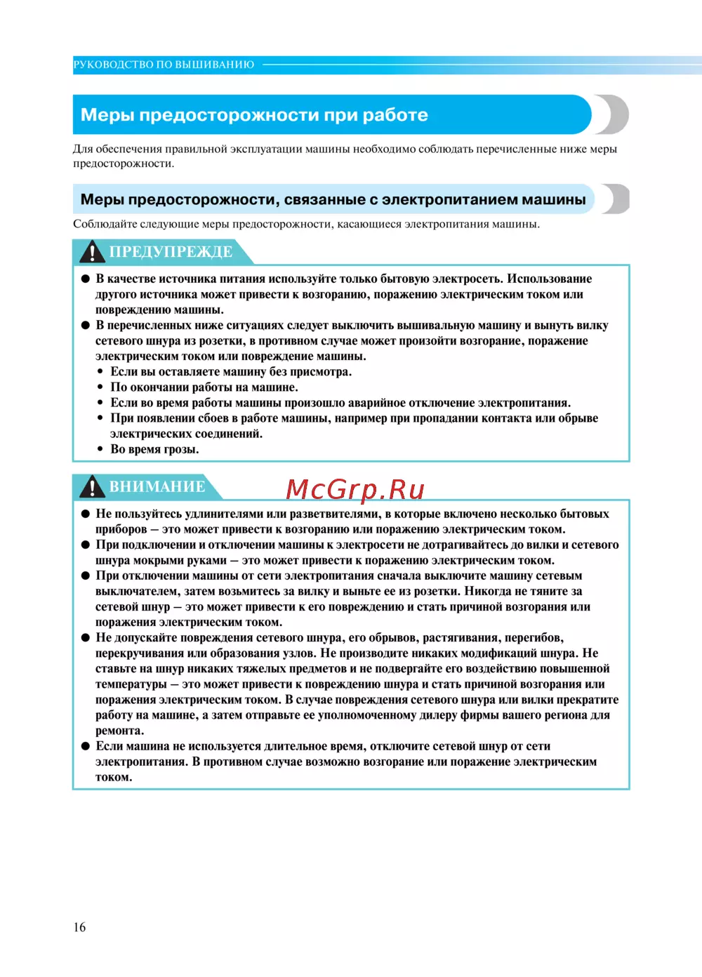 Узнайте о мерах предосторожности при работе с вышивальной машиной. Соблюдайте правила безопасности для предотвращения возгораний и поражений электрическим током.