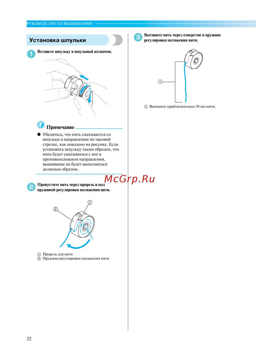 - Используйте только шпульки входящие в комплект поставки данного устройства намотки шпулек p.231