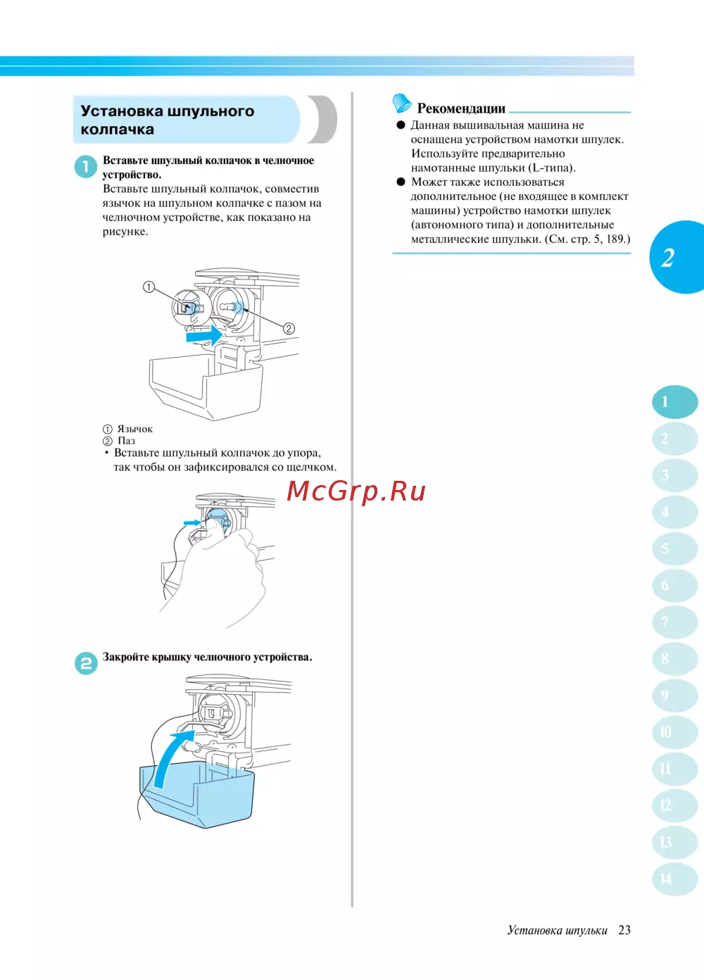 - Используйте только шпульки входящие в комплект поставки данного устройства намотки шпулек p.231