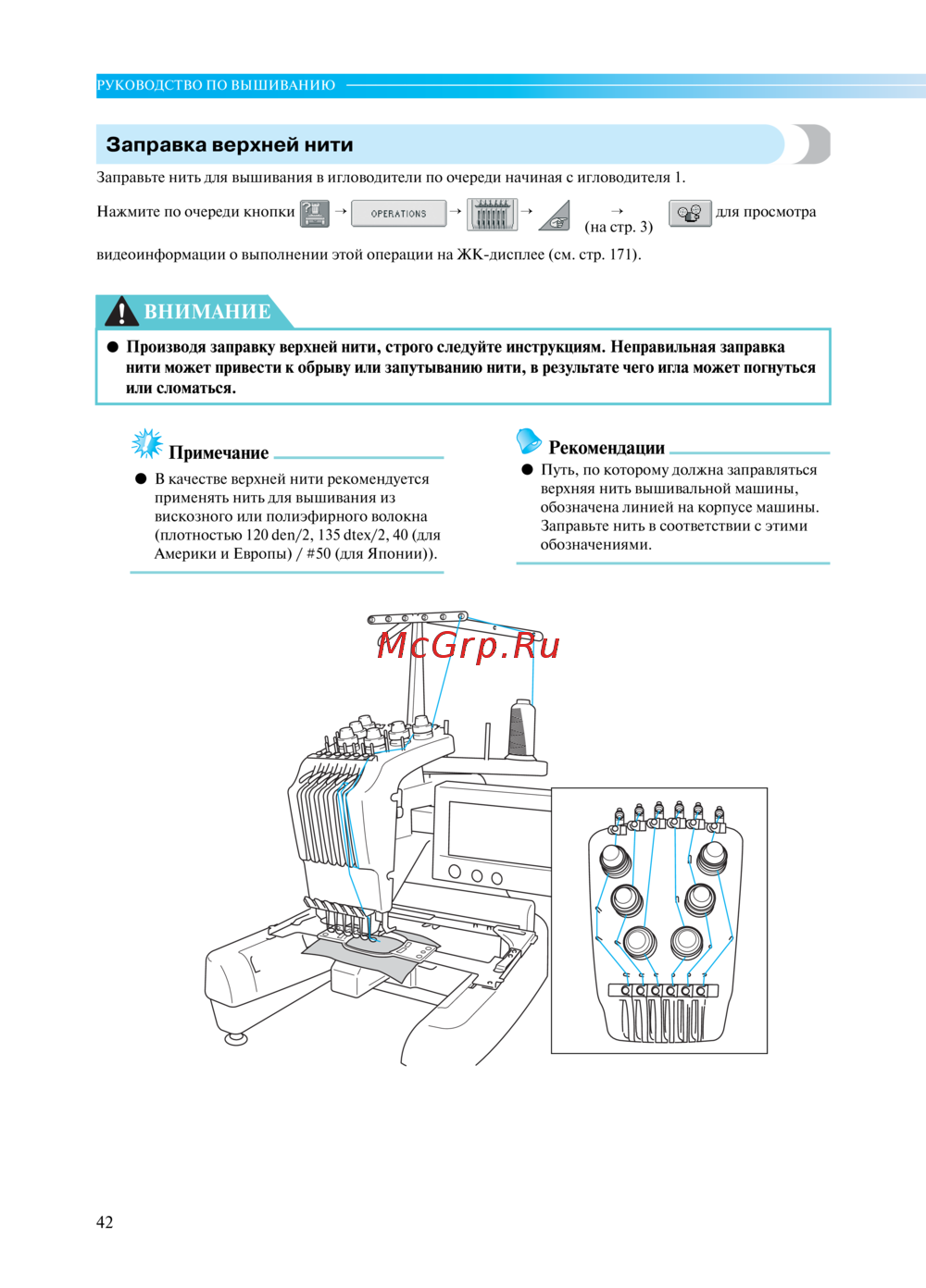 ● Производя заправку верхней нити, строго следуйте инструкциям. Неправильная заправка