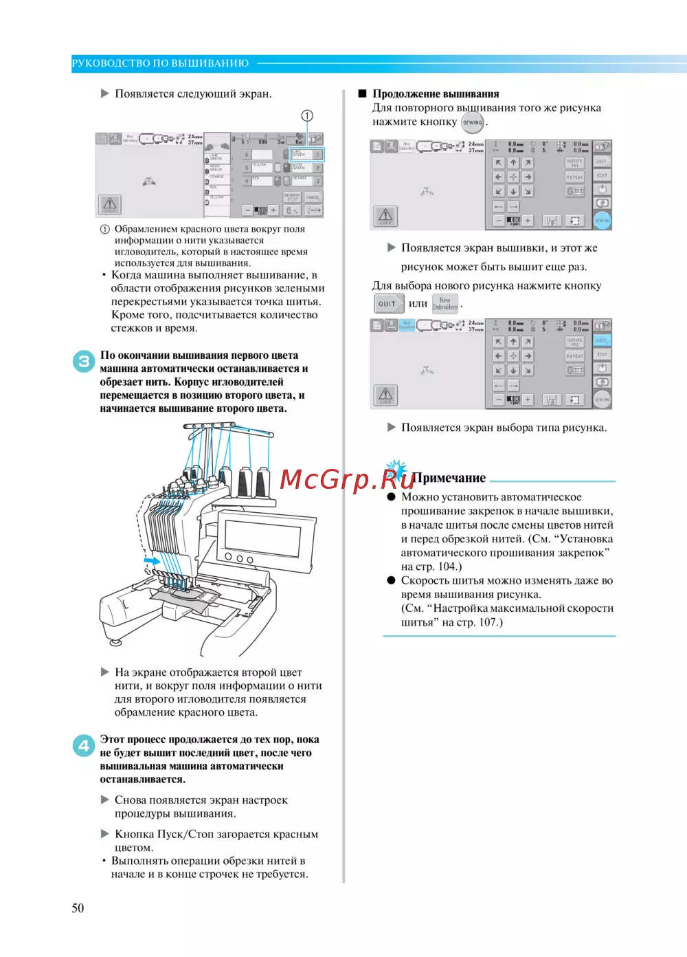• Когда машина выполняет вышивание, в