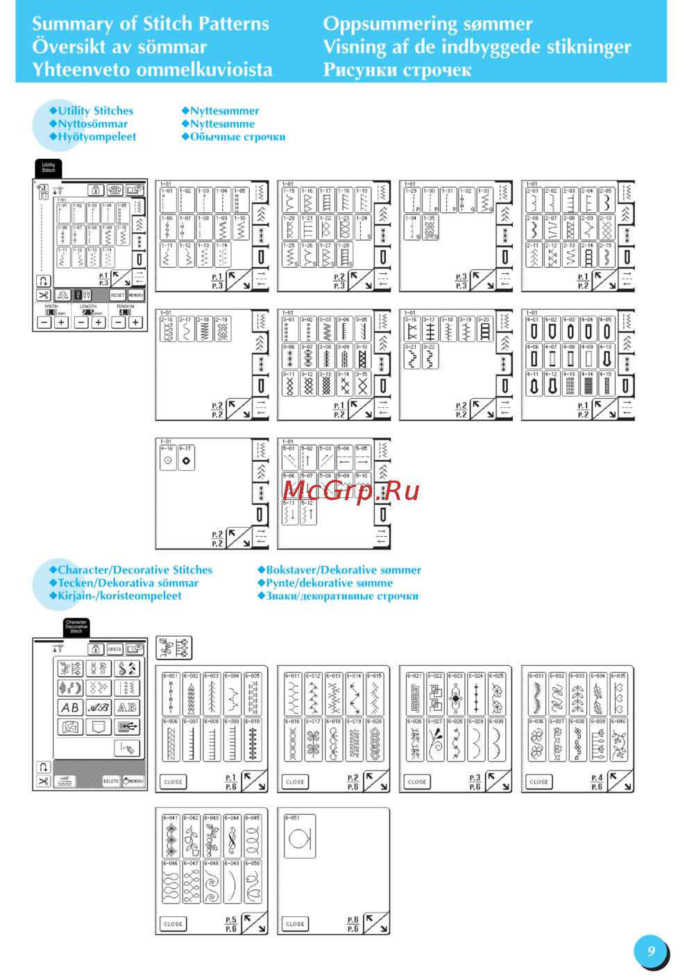 - Summary of stitch patterns oppsummering sømmer översikt av sömmar visning af de indbyggede stikninger yhteenveto ommelkuvioista p.11