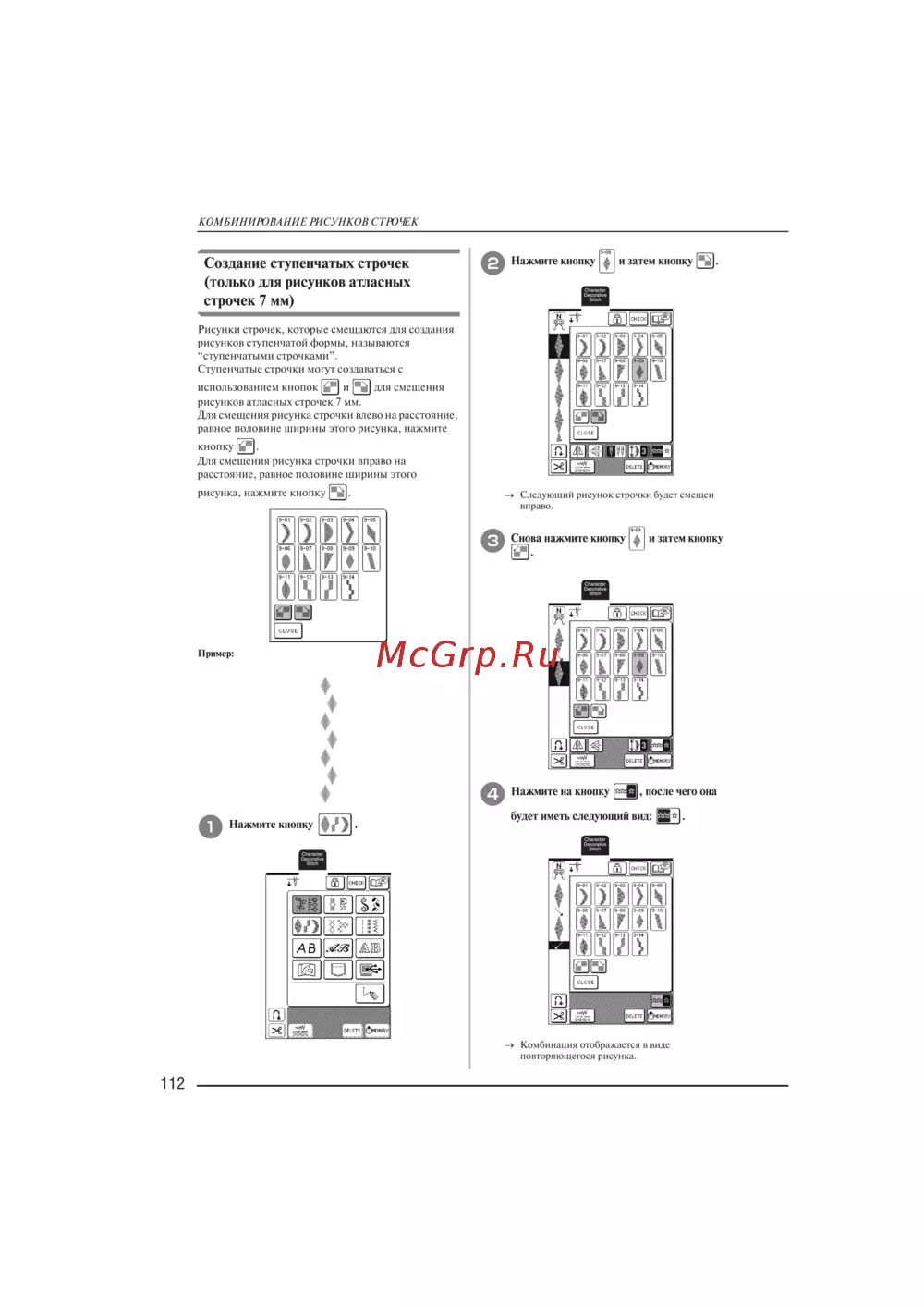 ![Brother INNOV-IS 2200 LAURA ASHLEY [114/0] Создание ступенчатых строчек только для рисунков атласных строчек 7 мм](/views2/1026175/page114/bg72.png)