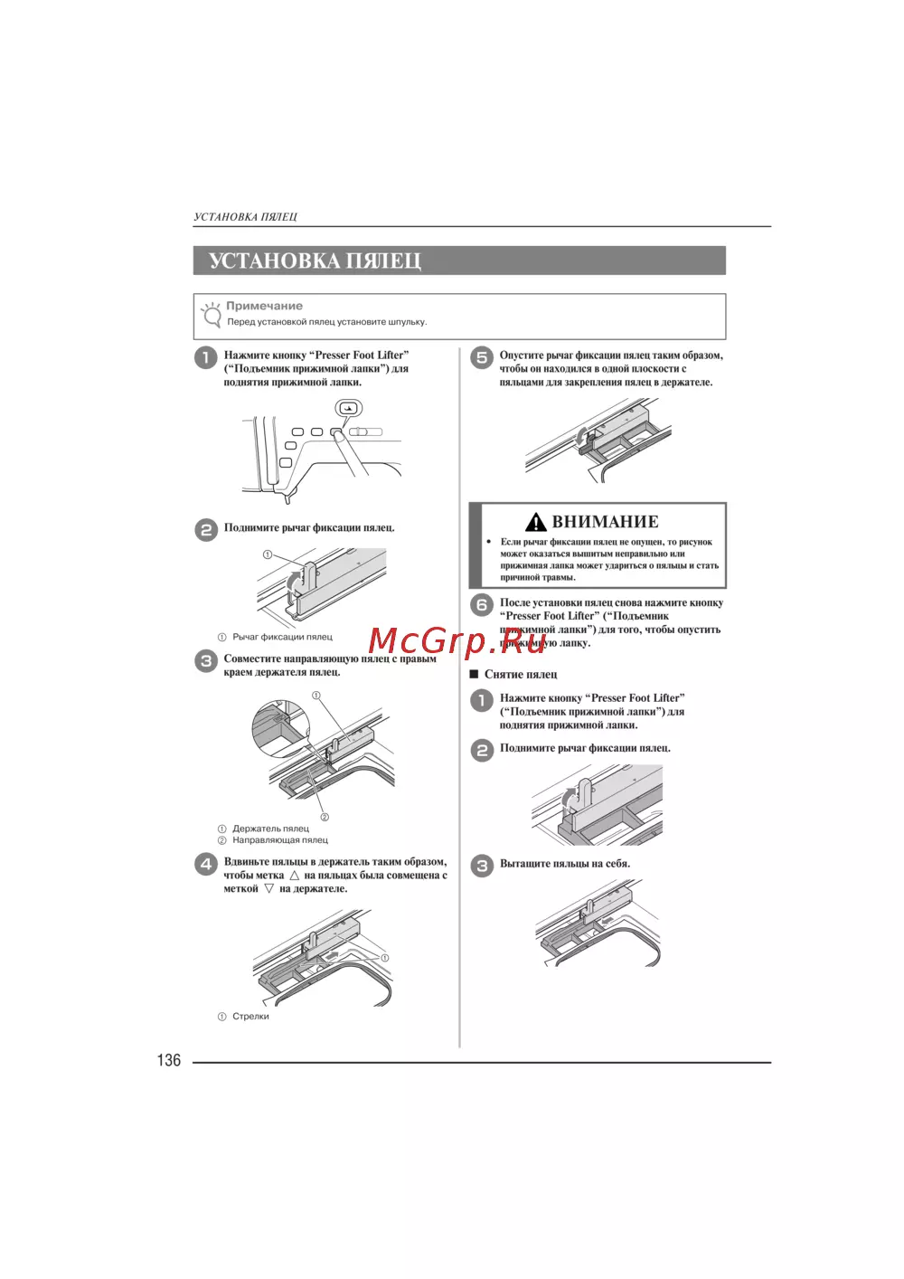 - После установки пялец в держатель убедитесь что рычаг фиксации пялец правильно опущен p.11