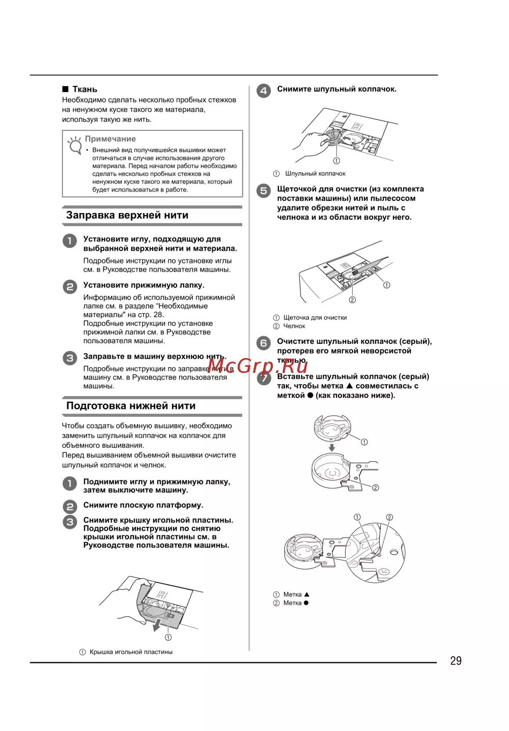 - Шпульный колпачок и крышка челночного устройства p.30