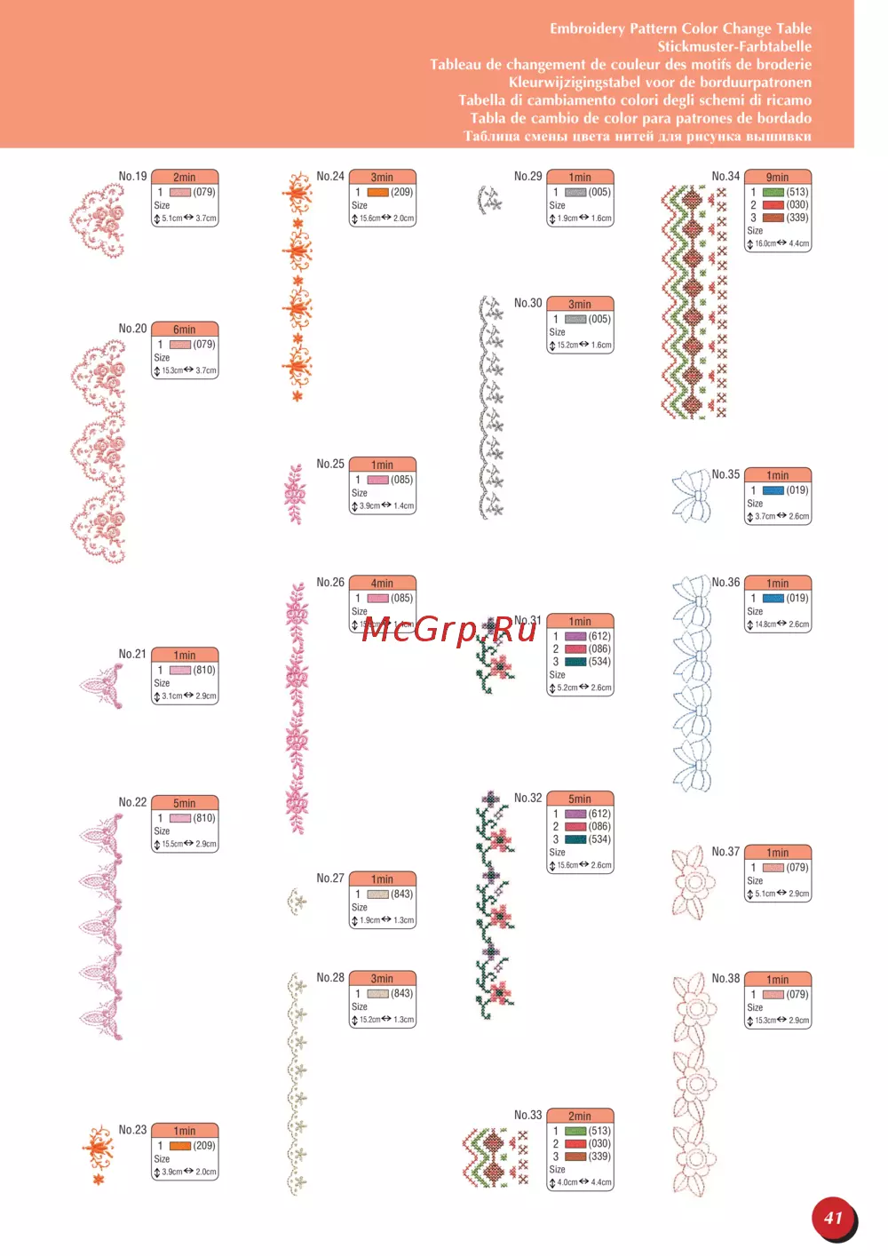 - Embroidery pattern color change table stickmuster farbtabelle tableau de changement de couleur des motifs de broderie kleurwijzigingstabel voor de borduurpatronen tabella di cambiamento colori degli schemi di ricamo tabla de cambio de color para patrones de bordado таблица смены цвета нитей для рисунка вышивки p.41