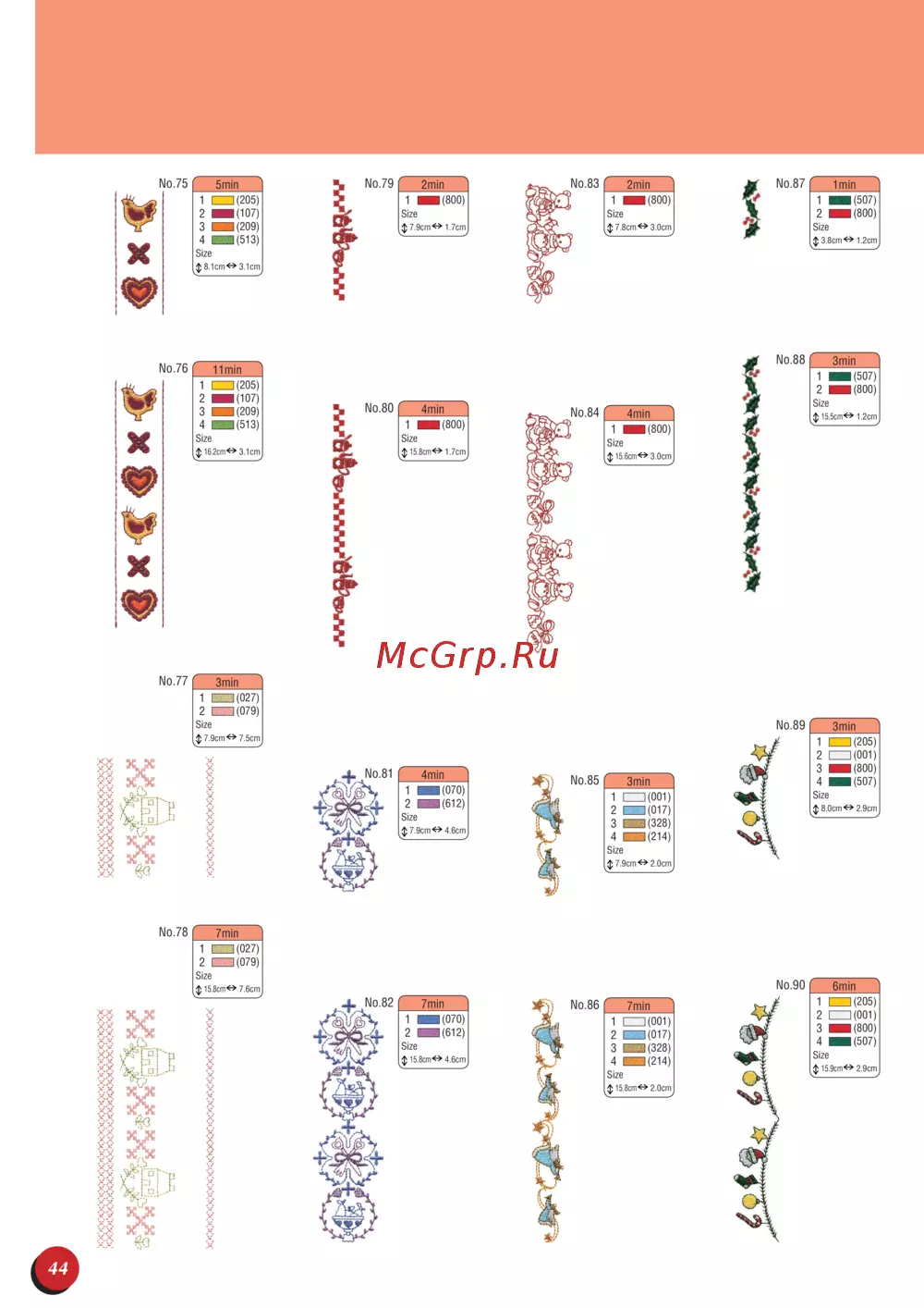 - Embroidery pattern color change table stickmuster farbtabelle tableau de changement de couleur des motifs de broderie kleurwijzigingstabel voor de borduurpatronen tabella di cambiamento colori degli schemi di ricamo tabla de cambio de color para patrones de bordado таблица смены цвета нитей для рисунка вышивки p.45