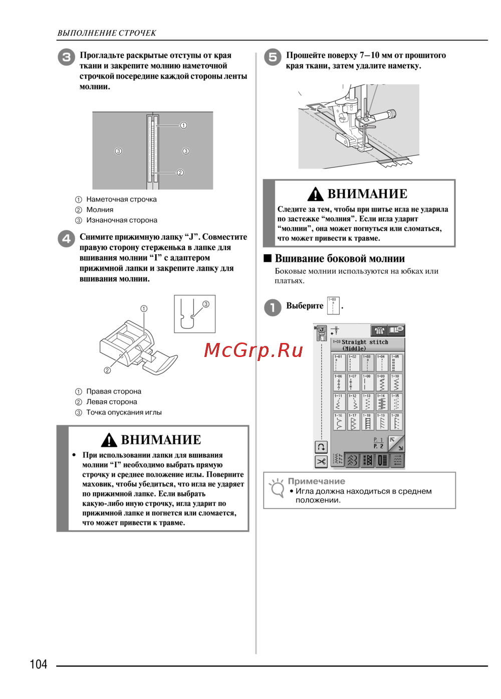 • При использовании лапки для вшивания