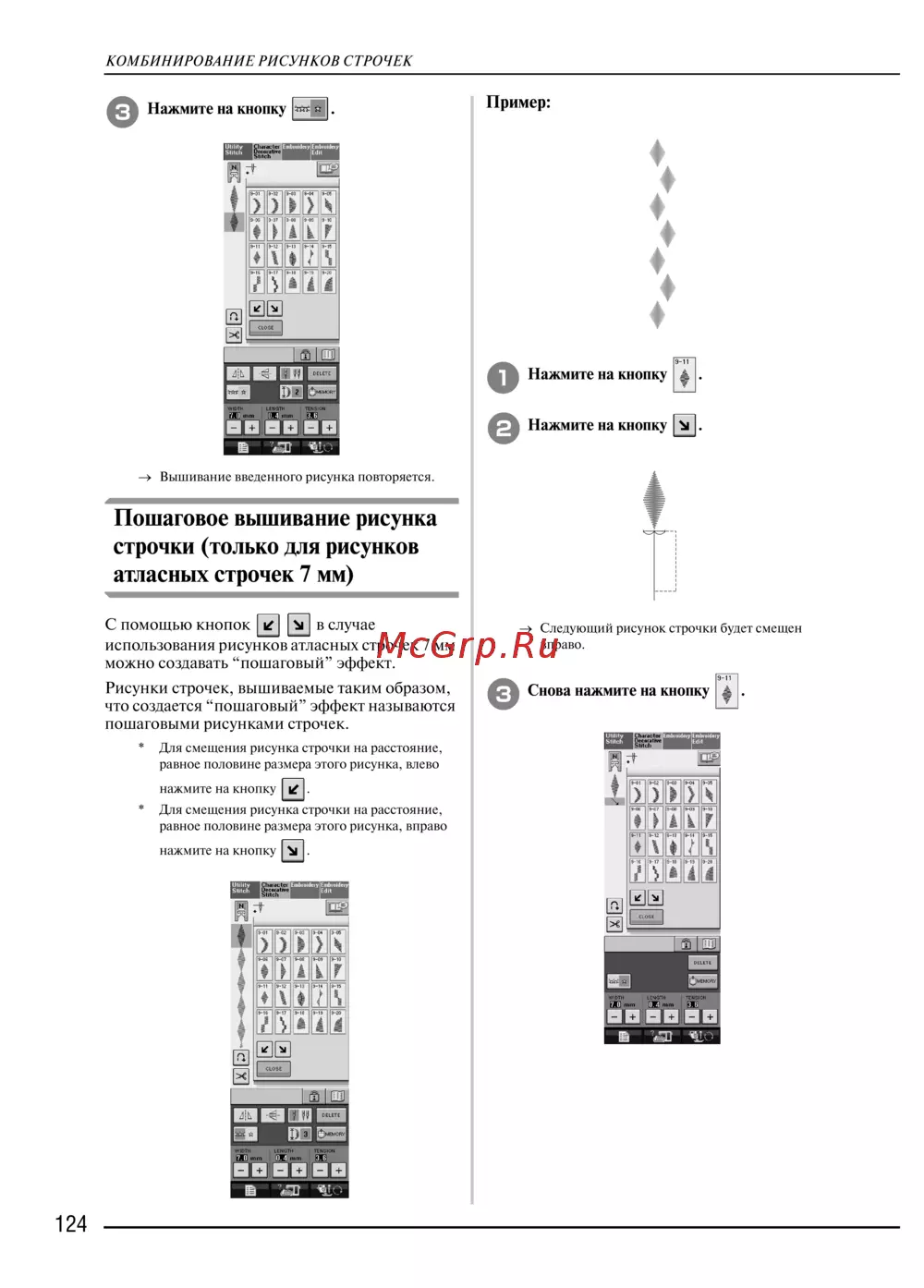 - При вышивании убедитесь в том что переключатель положения гребенок транспортера на вышивальном модуле находится в правом положении при установленном вышивальном модуле также можно выполнять обычные и декоративные строчки установите переключатель положения гребенок транспортера на вышивальном модуле в соответствующее положение p.13