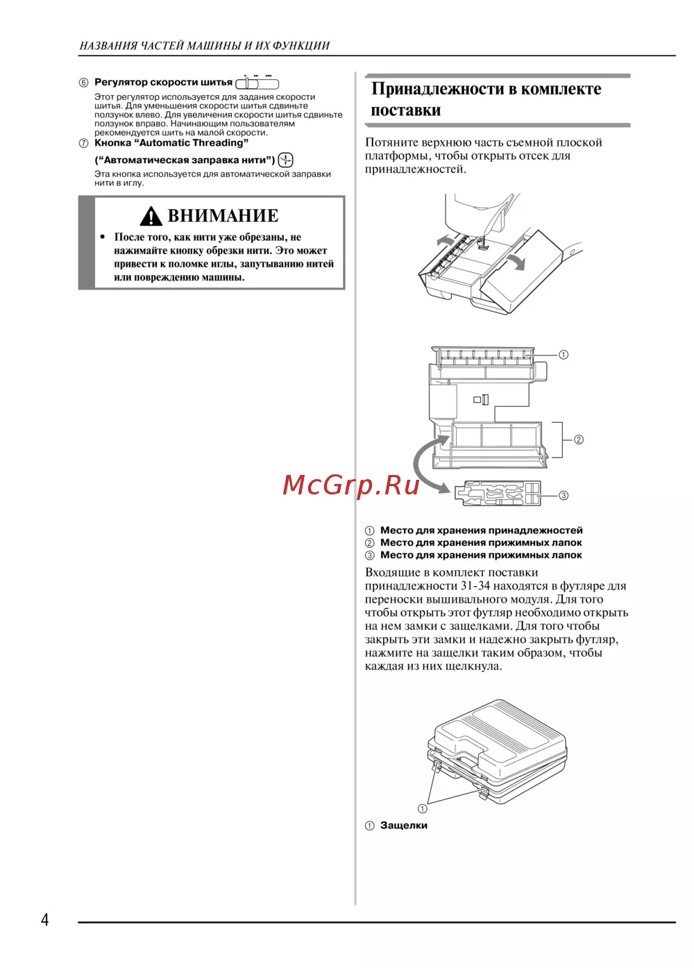 - Входящие в комплект поставки принадлежности 31 34 находятся в футляре для переноски вышивального модуля для того чтобы открыть этот футляр необходимо открыть на нем замки с защелками для того чтобы закрыть эти замки и надежно закрыть футляр нажмите на защелки таким образом чтобы каждая из них щелкнула p.14