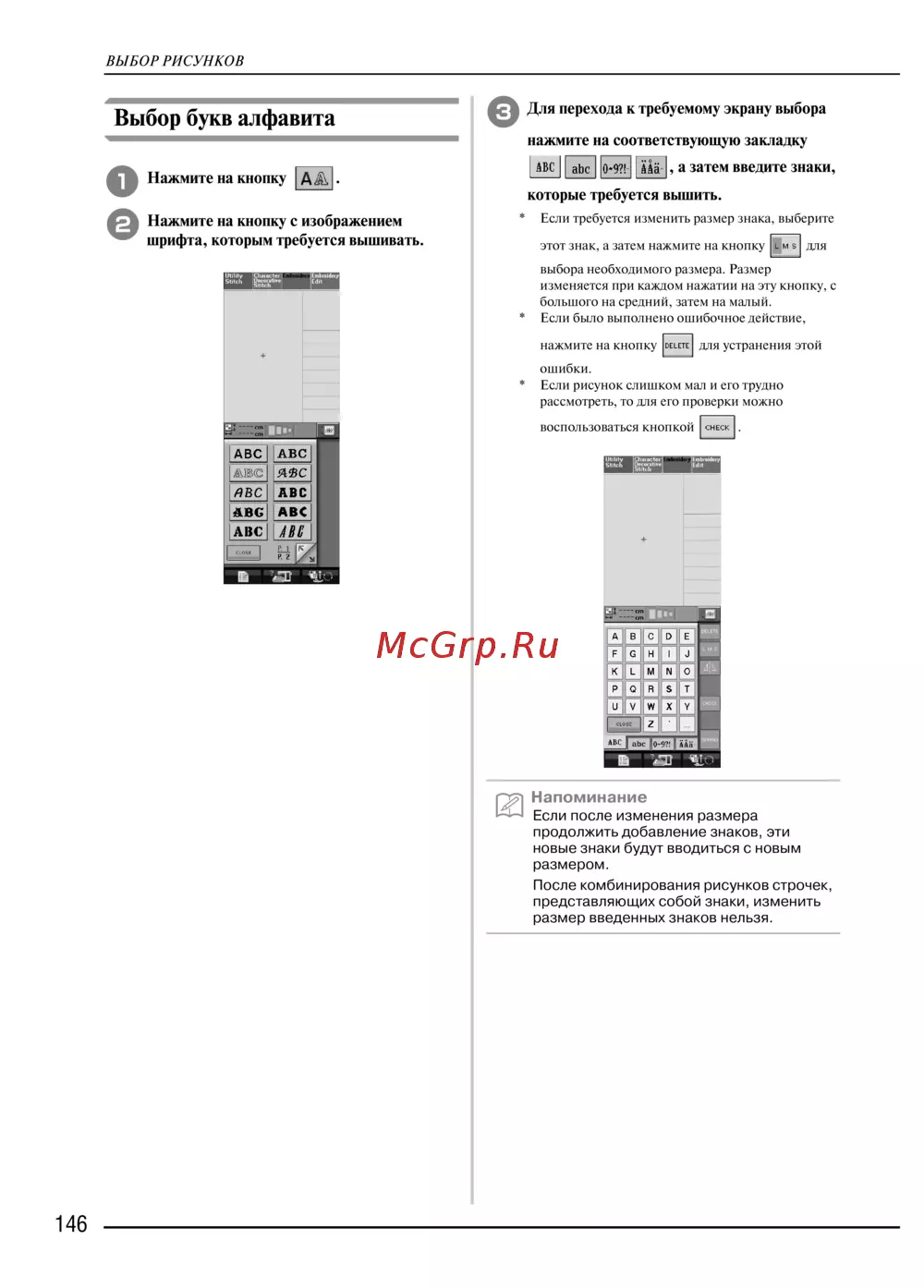 Узнайте, как выбрать буквы алфавита и изменить их размер для вышивки. Пошаговое руководство по использованию кнопок и закладок для удобства работы.
