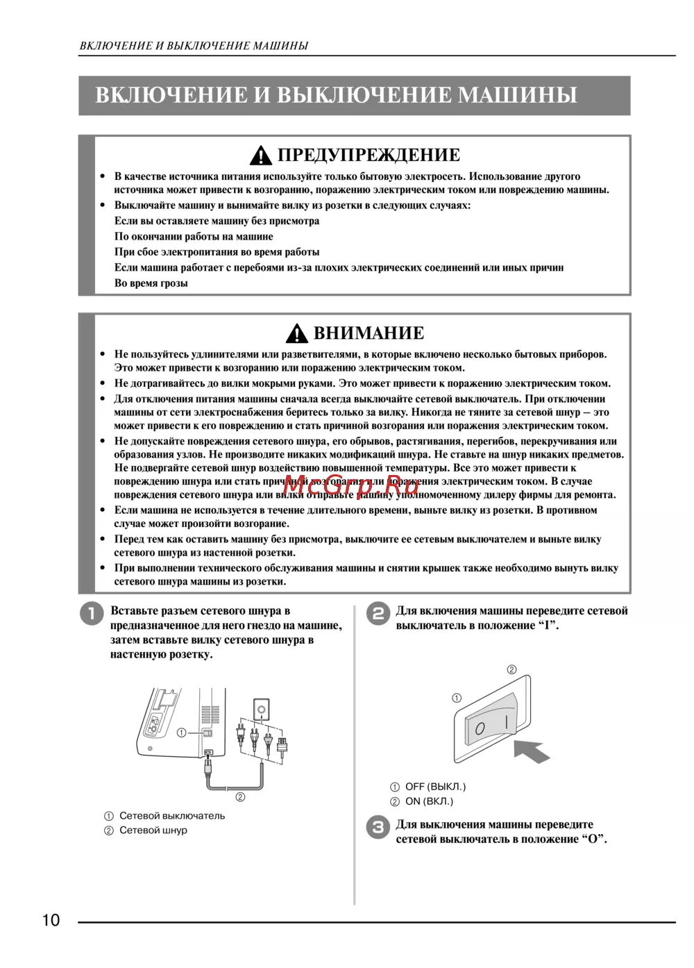 • Для отключения питания машины сначала всегда выключайте сетевой выключатель. При отключении