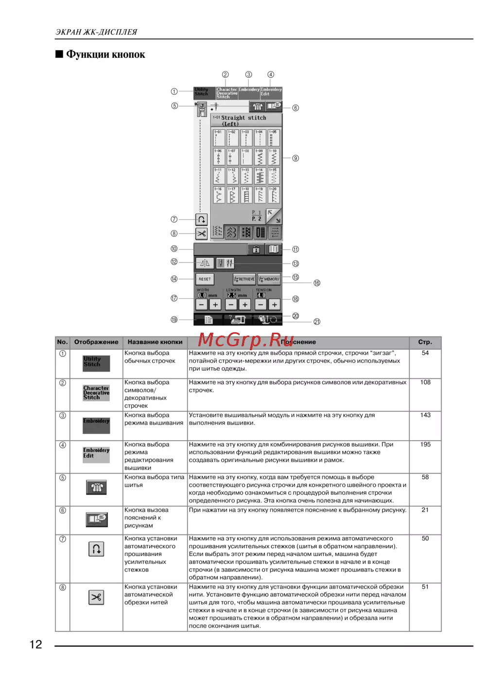Узнайте о функциях кнопок на ЖК дисплее швейной машины. Выбор строчек, режимы вышивания и редактирования, автоматическая обрезка нитей и многое другое.