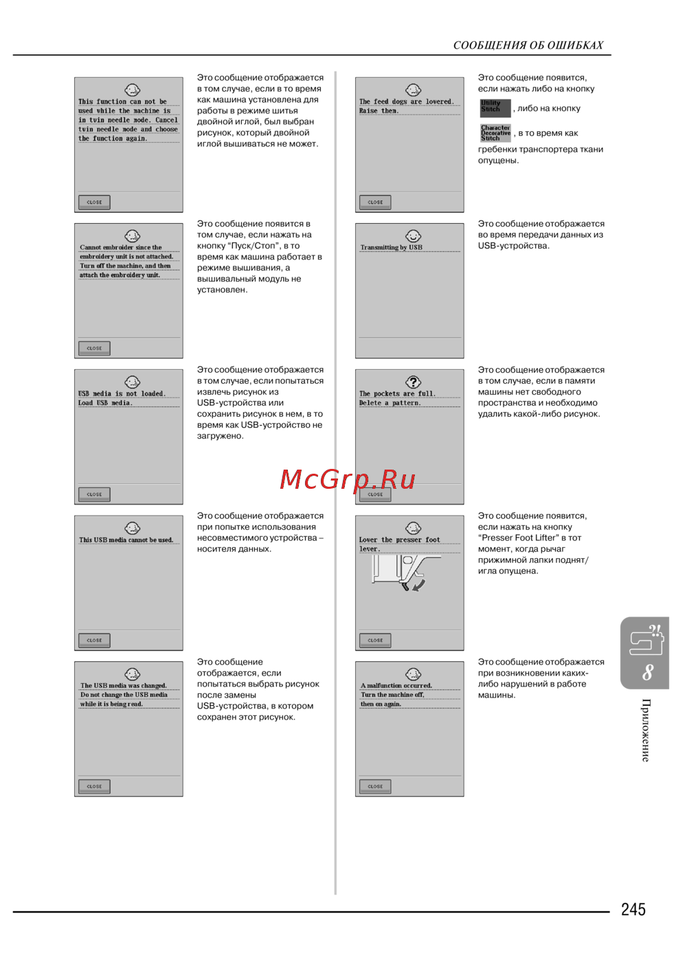 - Если нажать на кнопку пуск стоп или на кнопку reverse reinforcement stitch в то время как машина не установлена должным образом или если эксплуатация осуществляется неправильно машина не запускается при этом звучит аварийный сигнал и на жк дисплее отображается сообщение об ошибке если появляется сообщение об ошибке следуйте инструкциям представленным в этом сообщении ниже приводятся пояснения к 55 сообщениям об ошибках пользуйтесь этими пояснениями по мере необходимости если при появлении на дисплее сообщения об ошибке нажать на кнопку p.251