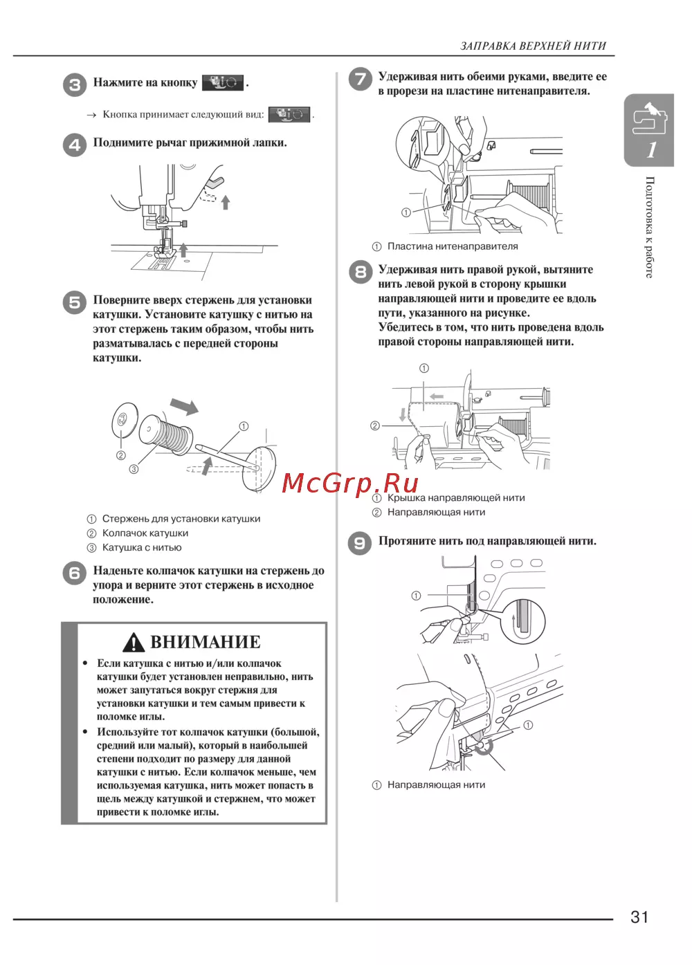 - Трудом не прилагайте усилия слишком сильная затяжка винта или слишком большое усилие в любом направлении вращения может привести к повреждению шпульного колпачка в случае повреждения шпульный колпачок возможно не сможет обеспечивать надлежащее натяжение нити p.243