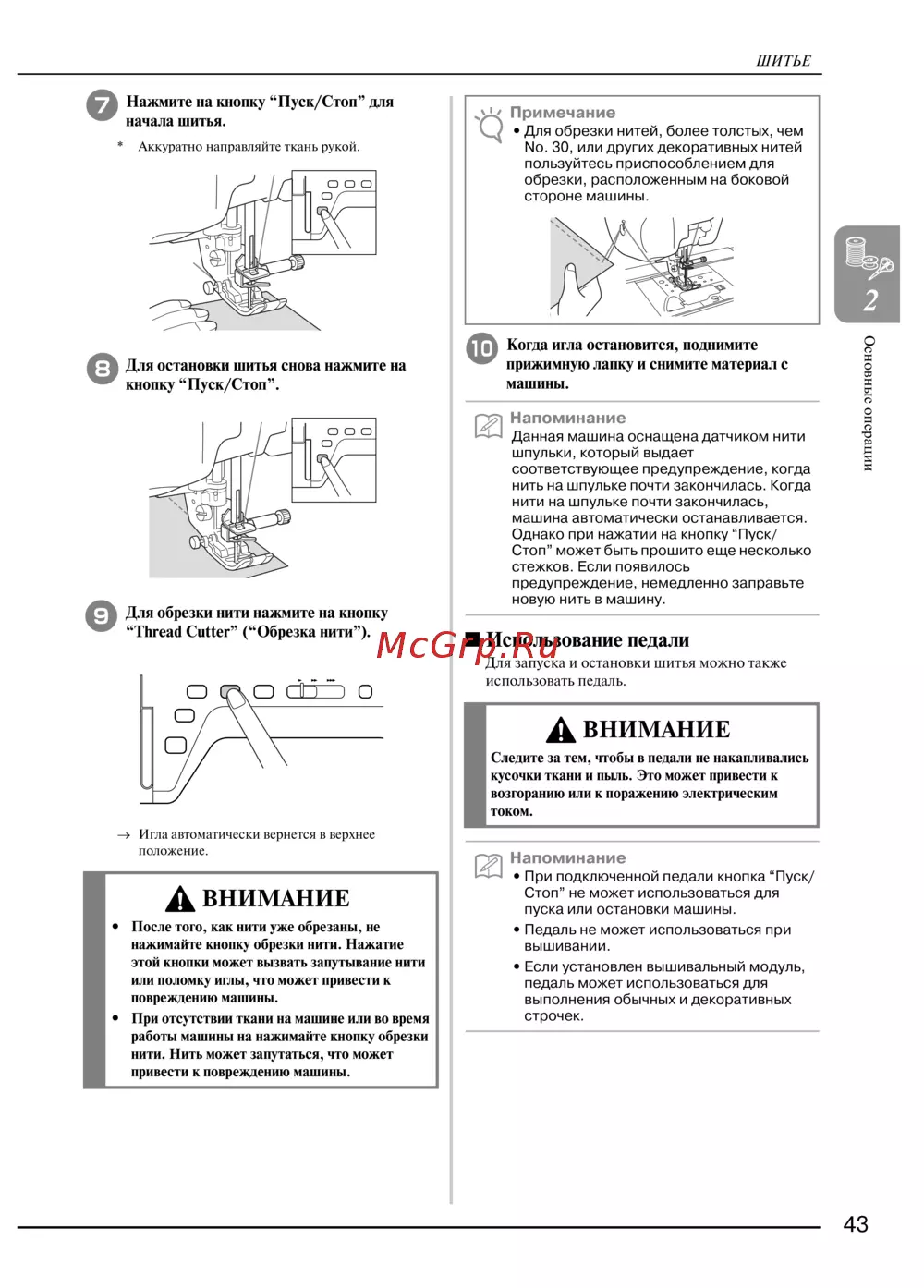 Узнайте, как правильно использовать швейную машину, включая запуск, остановку и обрезку нитей. Следуйте рекомендациям для безопасного шитья.
