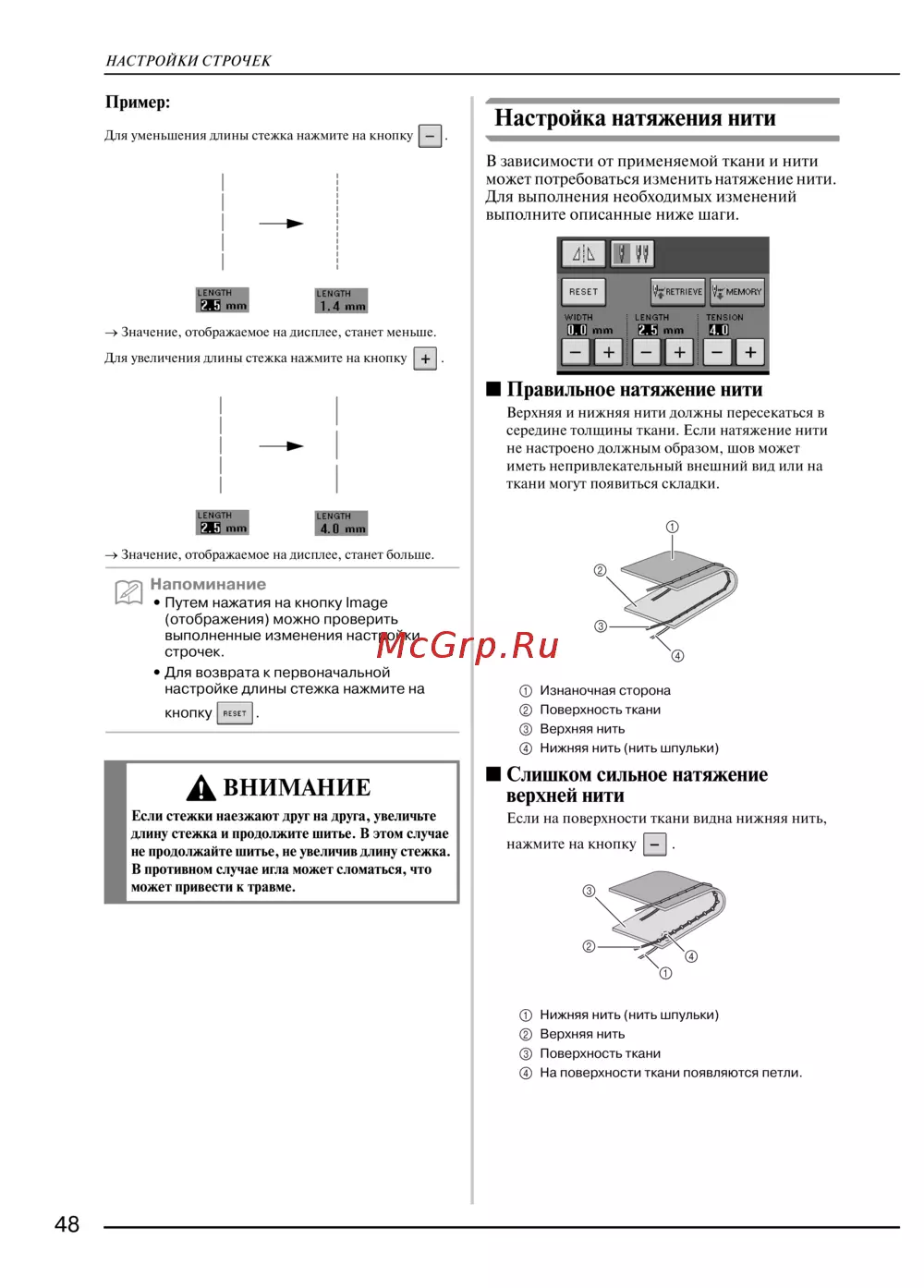 - Чтобы увеличить натяжение нижней нити будьте осторожны не затягивайте винт слишком сильно p.243